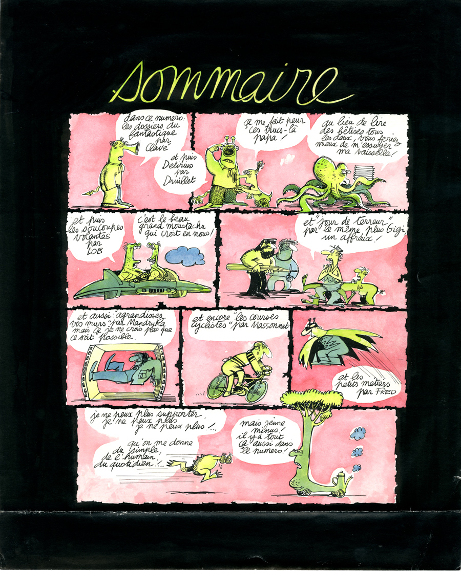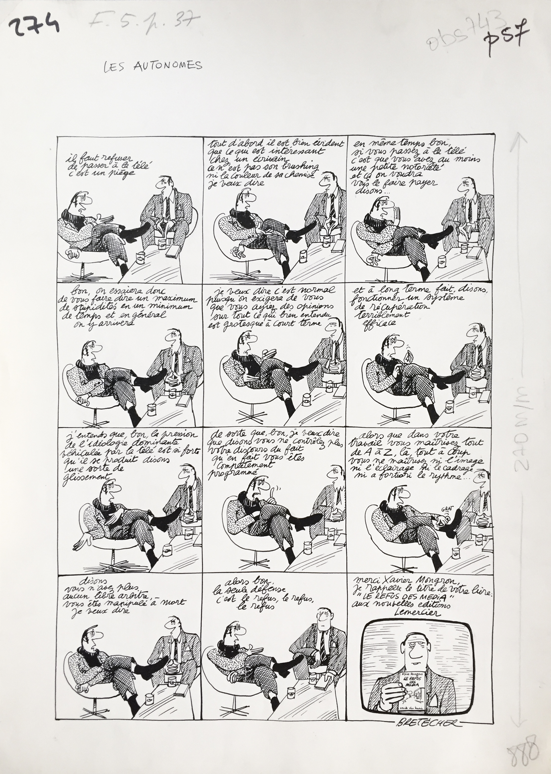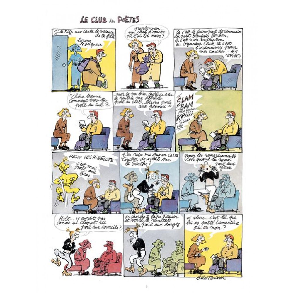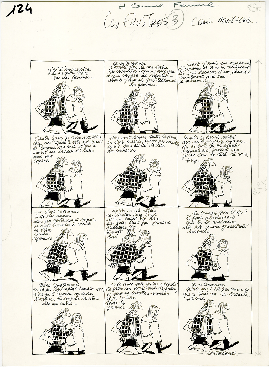 Comme le souligne Cookie Dingler dans sa chanson (peu d’auteurs ou autrices de bande dessinée ont eu l’honneur de voir leur nom dans une chanson), les lecteurs se précipitent pour lire Bretécher dans le Nouvel Obs à partir de 1973. C’est la naissance de sa série Les frustrés.