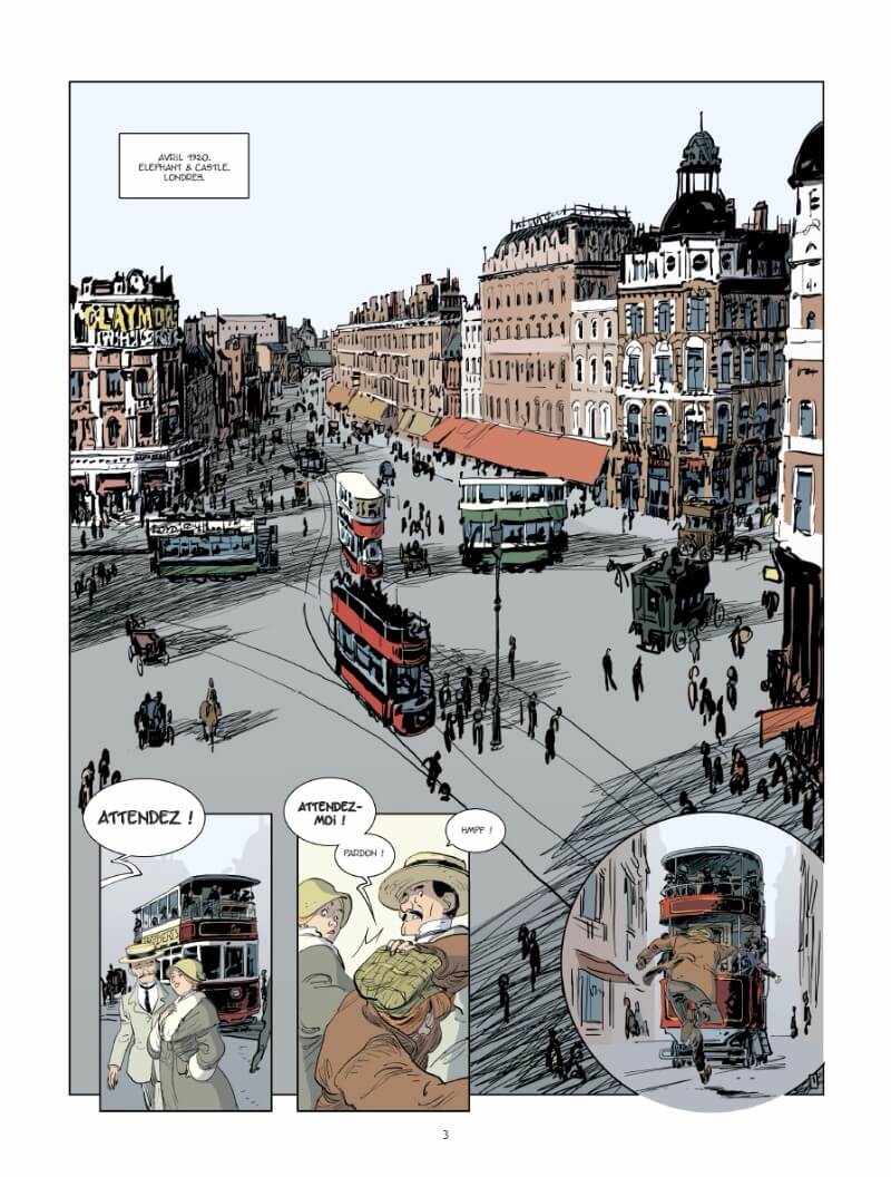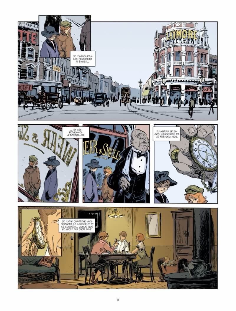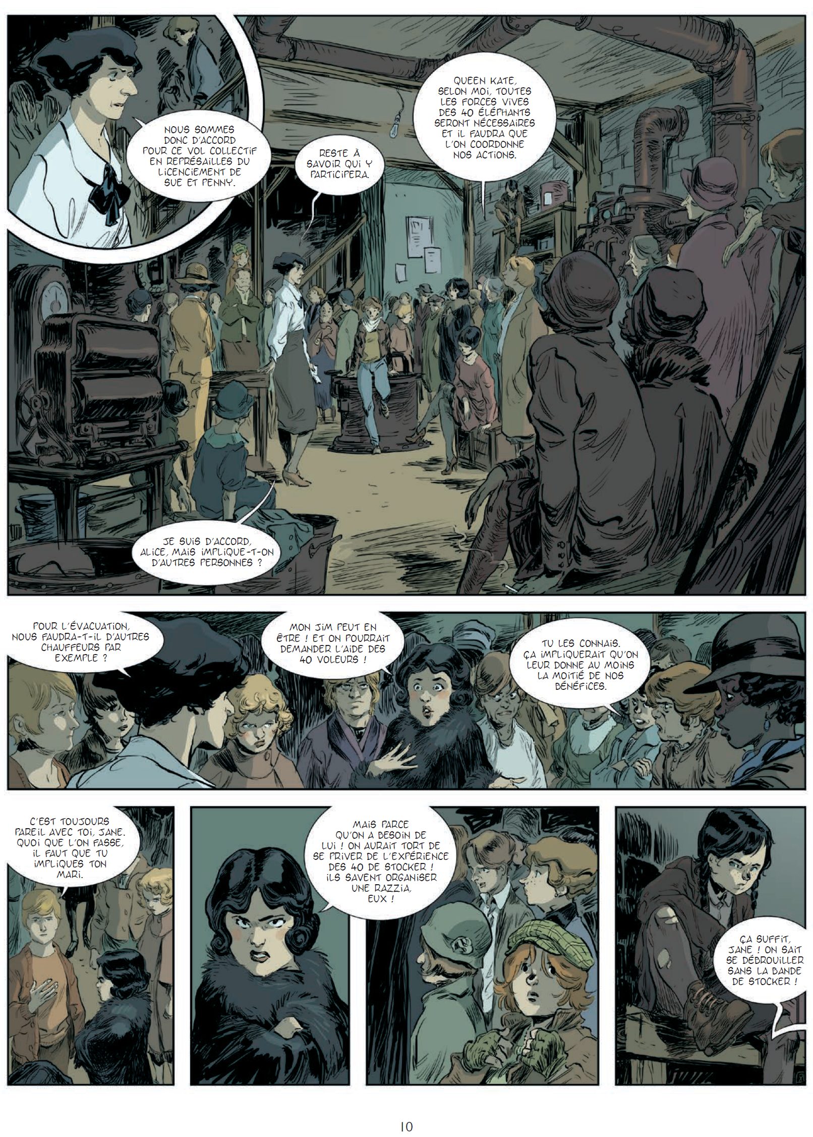Résumé de l’album : Le crime est une affaire de professionnelles. Londres 1920. Elles sont quarante. Voleuses, tueuses, kidnappeuses, cambrioleuses, proxénètes… Issues des divers milieux de la société, elles ont fait du crime leur affaire et se sont associées pour plus d’efficacité. Lorsqu’arrive Florrie « doigts de fée », jeune pickpocket talentueuse, toute l’organisation se révèle fragile et une lutte interne risque d’éclater. Le moment est mal choisi, car les éléphants doivent faire face à une police de plus en plus performante et à un gang masculin rival reconstitué et bien décidé à reprendre son territoire.