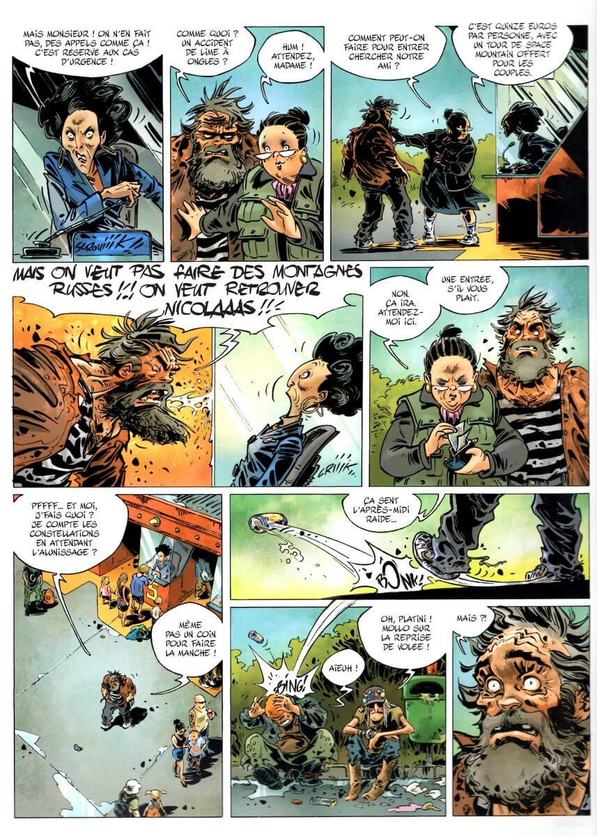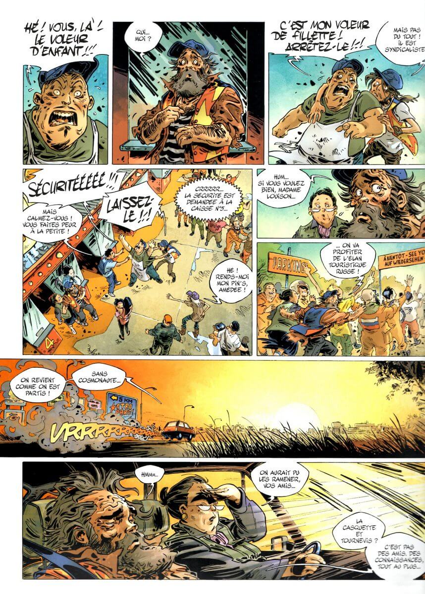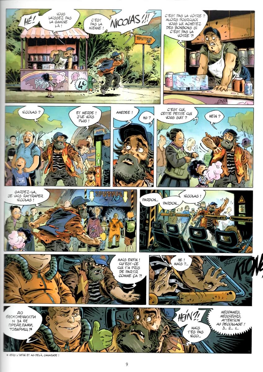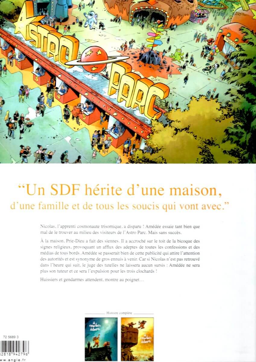 Résumé de l’éditeur : Nicolas a disparu ! Amédée essaie tant bien que mal de le trouver au milieu des visiteurs du Parc de l’Espace. À la maison, Prie-Dieu a accroché sur le toit de la baraque les signes des trois religions monothéistes, provoquant un afflux des adeptes de tout poil. Ce qui n’est pas du goût d’Amédée, surtout que la priorité serait plutôt de retrouver l’apprenti cosmonaute ! Car huissiers et gendarmes attendent, montre au poignet. Si Nicolas n’est pas là rapidement, Amédée ne sera plus son tuteur et ce sera l’expulsion pour les trois clochards !