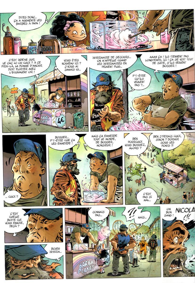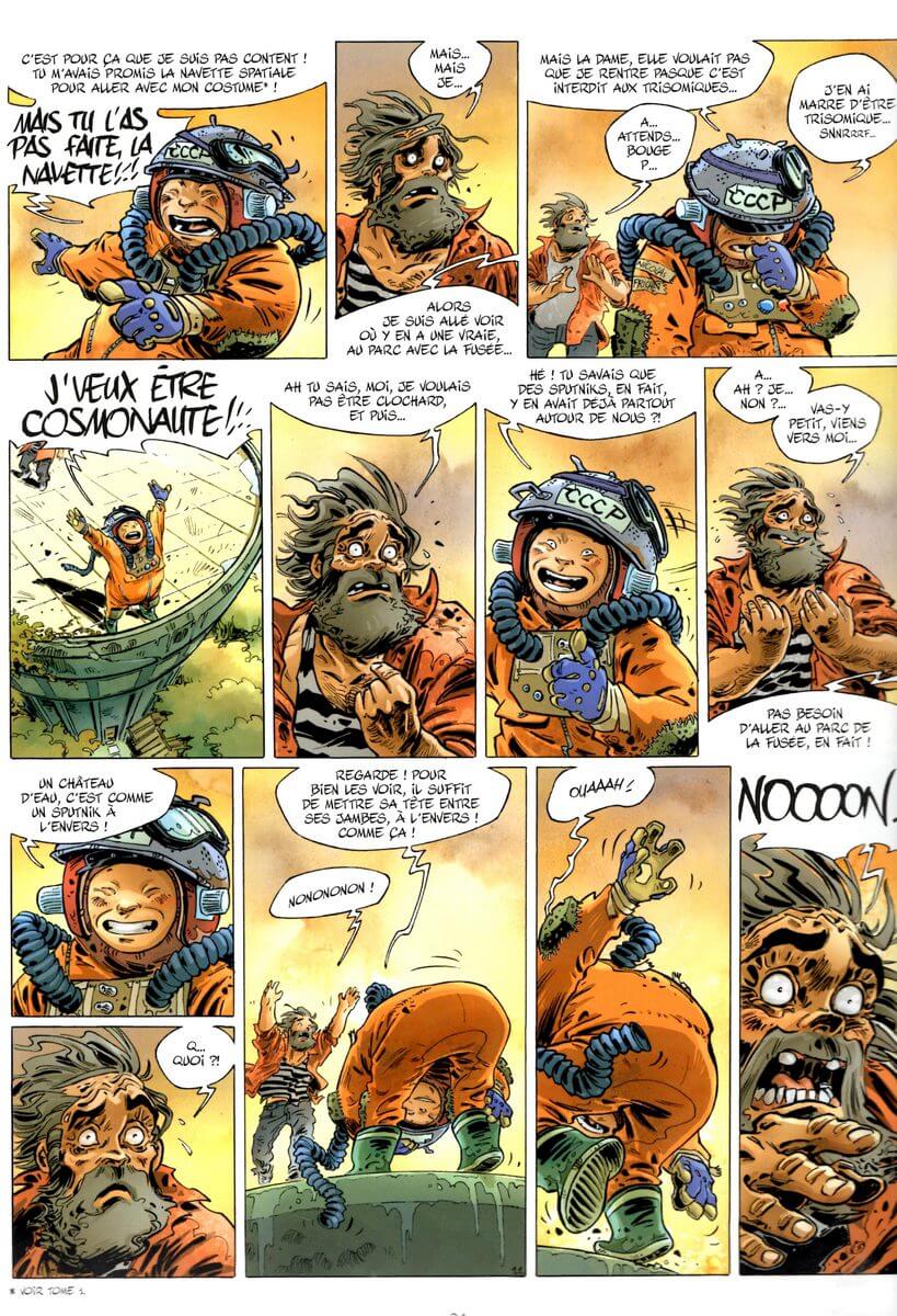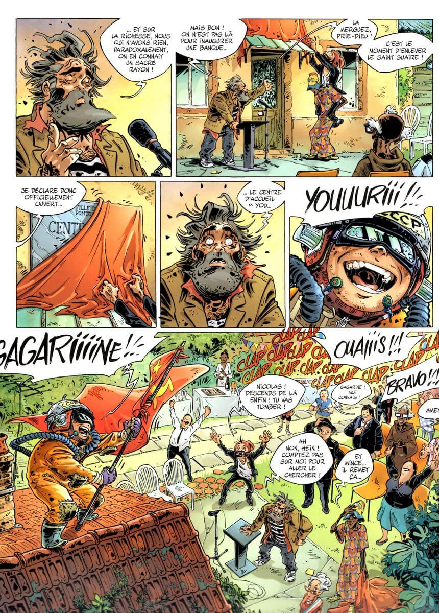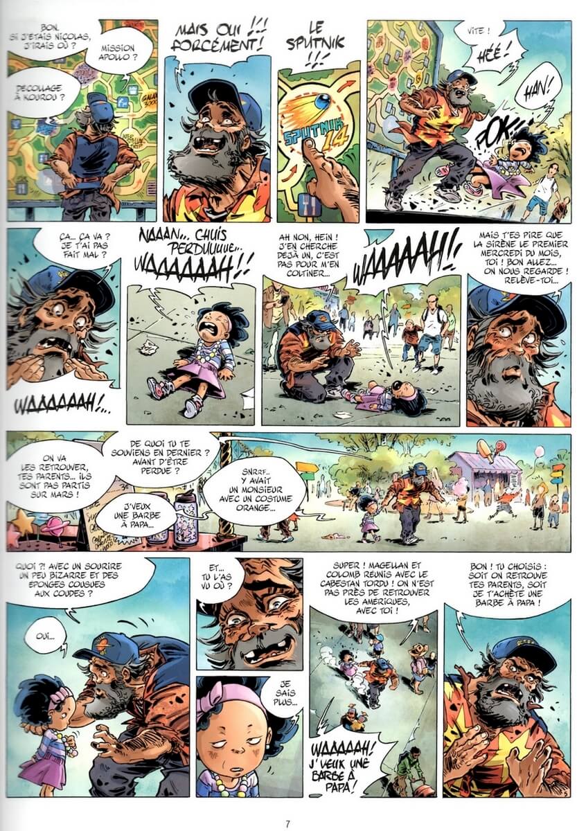 Résumé de l’éditeur : Nicolas a disparu ! Amédée essaie tant bien que mal de le trouver au milieu des visiteurs du Parc de l’Espace. À la maison, Prie-Dieu a accroché sur le toit de la baraque les signes des trois religions monothéistes, provoquant un afflux des adeptes de tout poil. Ce qui n’est pas du goût d’Amédée, surtout que la priorité serait plutôt de retrouver l’apprenti cosmonaute ! Car huissiers et gendarmes attendent, montre au poignet. Si Nicolas n’est pas là rapidement, Amédée ne sera plus son tuteur et ce sera l’expulsion pour les trois clochards !