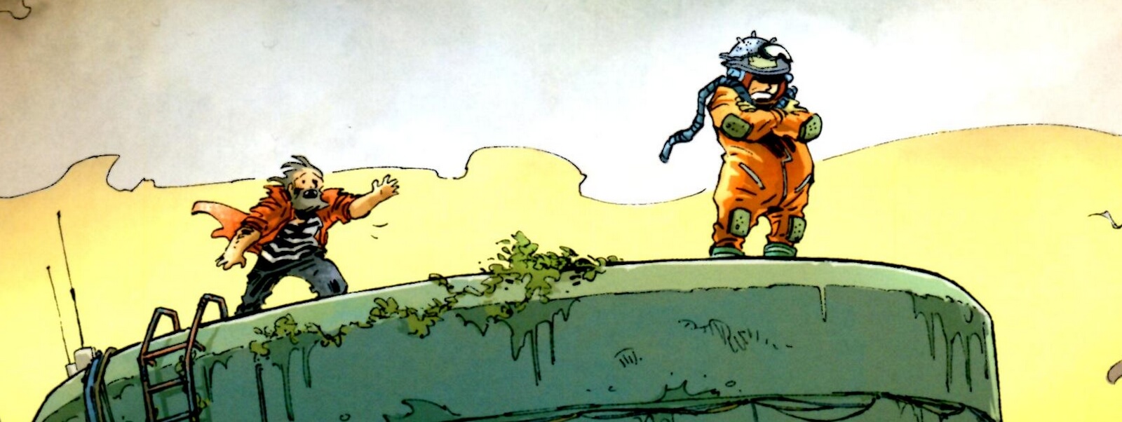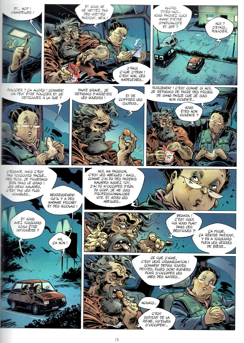 En effet, Jean-Pierre Rousseau de son vrai nom, n’est pas épargné dans ce récit graphique. Mais quelle que soit la situation (comme se retrouver sur un « sputnik à l’envers » pour empêcher un drame, supporter un cours sur les bienfaits de la Reine des abeilles régnant dans sa sa ruche, ou s’attacher les services de frères religieux pour former une équipe d’investigations), le scénariste apporte à son héros la psychologie et l’humanité nécessaires pour qu’il réagisse intelligemment. Et ainsi donner l’image d’un grognon au grand cœur.