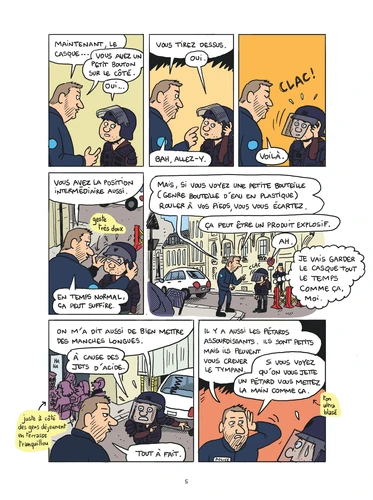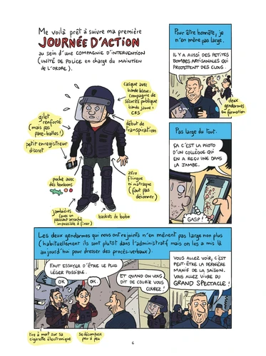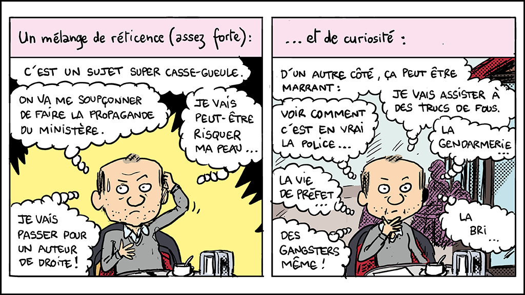 L’intérêt de cette nouvelle enquête dessinée, comme dans la plupart des précédentes, réside dans la distance installée entre l’auteur et son sujet. Ni agressivité ni jugement, mais une volonté affichée de « montrer les gens, simplement, sous une lumière un peu différente », dans leur quotidien. Ici, ce ne sont pas toujours les hauts gradés ni même leur ministre qui distribuent la parole mais ceux qui sont sur le terrain, exerçant une profession pas toujours facile. « C’est le paradoxe français, résume un policier, on veut qu’il y ait plus de sécurité mais on veut qu’il n’y ait aucun contrôle ».
