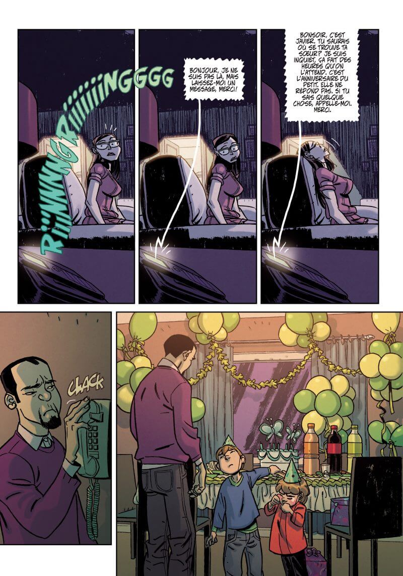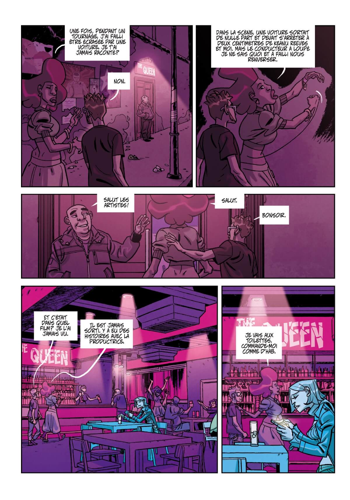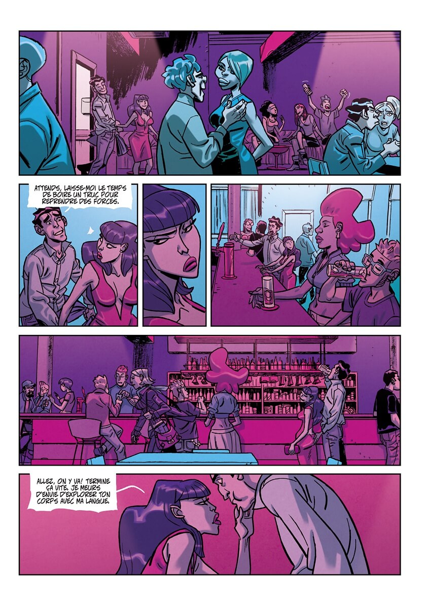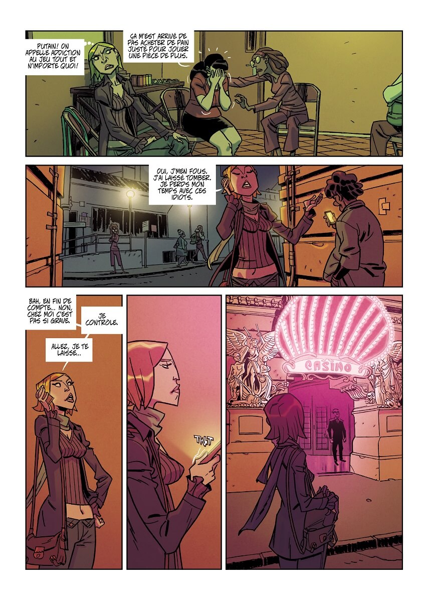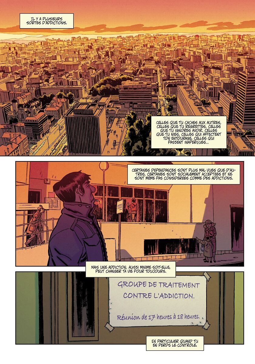 Aidé pour les couleurs par Aintzane Landa, Pedro J. Colombo dévoile de très belles planches. Son trait d’une belle modernité lui permet de réaliser des pages superbes. Le dessinateur de Au second plan (avec le même scénariste, Diabolo) utilise un découpage fort et rythmé qui restitue parfaitement l’ambiance sombre de Addiction.
