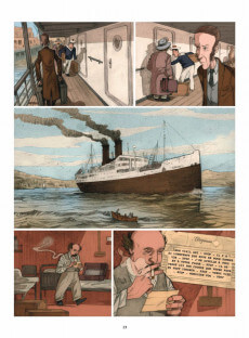 Les dessins, d’une beauté et d’une tonalité très sobres, accompagnent parfaitement bien cette époque. Quand les grands trajets se faisaient à bord de paquebots et les messages étaient transmis par télégrammes ou cablogrammes.