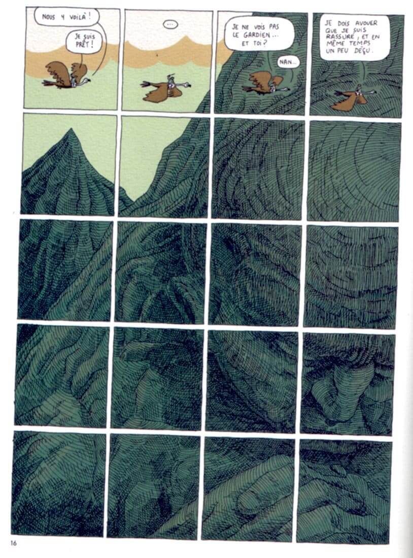 Si le scénario enchante le lecteur, le gros point fort réside dans la partie graphique de très haute volée. L’album est fondé sur des trouvailles graphiques intelligentes : un découpage en gaufrier de 9 à 20 cases, des illustrations qui débordent sur plusieurs vignettes qui forment un unique dessin; la lecture classique de gauche à droite et de haut en bas est bousculée par le cheminement du personnage principal. Tout cela donne un rythme à la fois rapide mais aussi appel à la méditation. Le trait minimaliste du talentueux auteur convient parfaitement à cette histoire à la fois minimaliste et grande dans son questionnement.