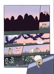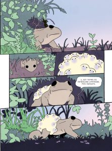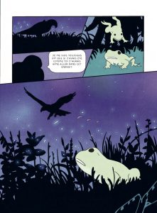 La grande force d’Alyte réside dans le point de vue narratif mis en place par Jérémie Moreau. L’auteur de Max Winson a choisi de raconter son récit à hauteur d’animaux. S’ils sont dotés de parole, ils ne sont pas anthropomorphisés. Tels qu’ils sont dans la nature, ils vont et viennent ; mangent, vivent et se reproduisent.