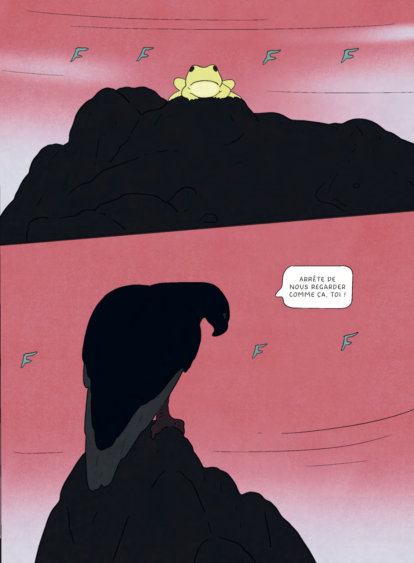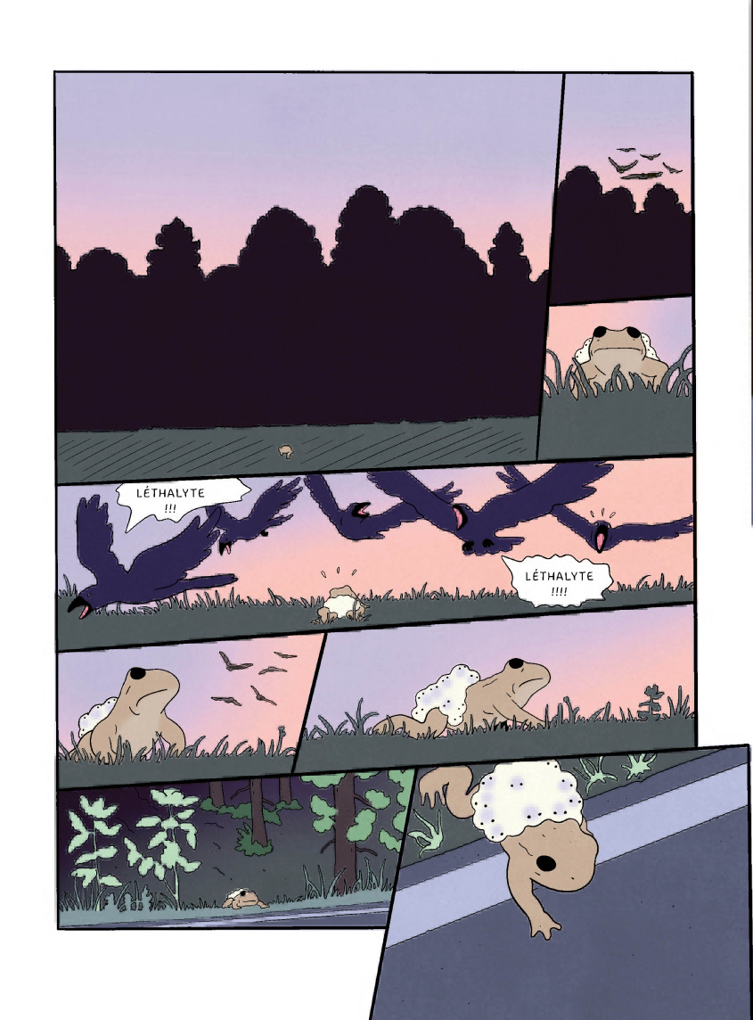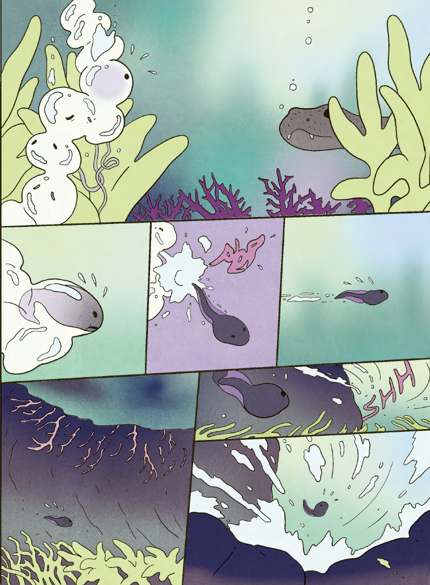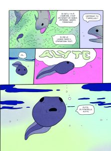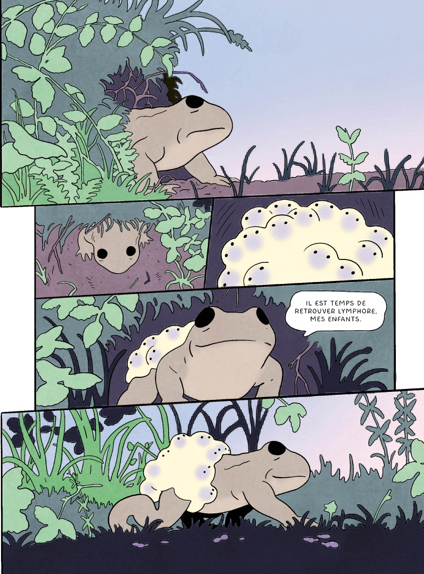 Si cette dernière bande dessinée était avant tout philosophico-contemplative, Alyte est un récit sur un temps long. Celui de la naissance d’un têtard à sa vie d’adulte, en passant par l’amour et l’accouplement.