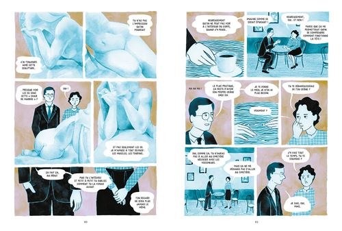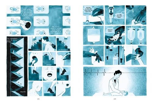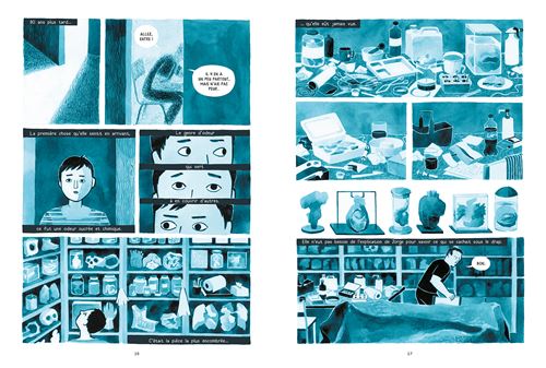 Quelques planches sont par ailleurs partiellement soulignées de touches et de tâches de rouge et de jaune. Comme pour apporter un peu de vie ou de lumière au récit. Ainsi mise en valeur, l’anatomie devient un élément à part entière du scénario. Les organes du corps humain, habituellement représentés en rouge pour leur donner un côté sanguinolent, se transforment, ici habillés de bleu, en objets de toute beauté.