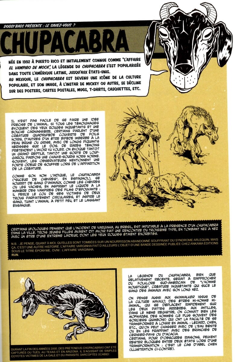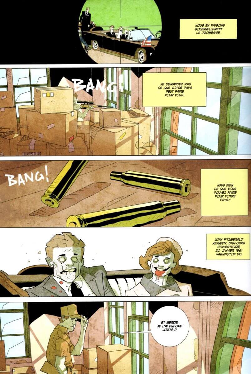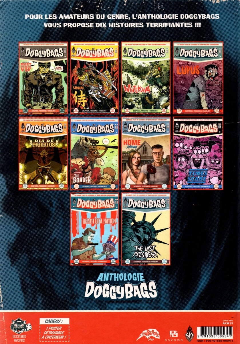 - The Last President de Run et Ducoudray : Le CFZ (voir histoire précédente) fait toujours rage dans les contrées américaines. Mais ce n’est certainement pas le souci majeur de Montgomery, le nouveau et dernier Président des États-Unis d’Amérique. Car pour lui le fléau dont il faut s’occuper prioritairement est l’arrivée massive et incessante des clandestins mexicains. Il s’apercevra vite qu’il s’est trompé de cible… Confiné de toute urgence dans un bunker souterrain durant quatre-vingt dix jours, le Président prend sont mal en patience. Isolé de tout, il ne se doute aucunement de ce qui se trame en haut… Décidément, quand il s’agit de zombies mêlés à une potentielle fin de civilisation, Run et Ducoudray sont diablement inspirés ! Pour clore cette Anthologie de Doggybags, les rôles s’inversent et le pouvoir change de main !