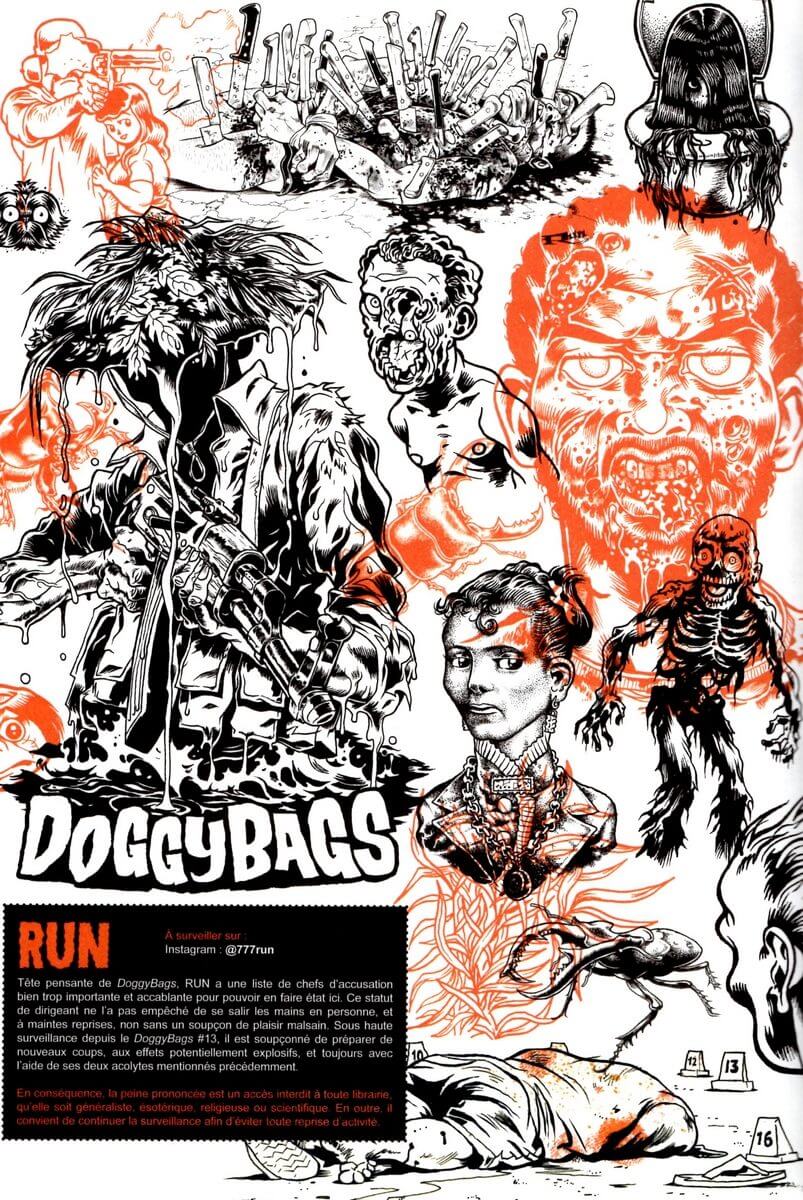 En février 2017, sortait le treizième et dernier tome de Doggybags. Fondée par le label 619 et orchestrée par Run depuis le premier numéro en 2011, il était dit que la série adulée par de nombreux lecteurs, ne pouvait s’arrêter là. Même si elle est officiellement terminée, l’auteur de Mutafukaz, entouré de tant d’autres artistes, entend le déchirement des fans. Fort de ses deux hors-séries (Doggybags présente) et récemment du one shot issu de cette même collection, Run offre cette Anthologie dont les histoires ont été choisies par les aficionados de ces aventures noires à souhait. Forcément subjectif, ce recueil horrifique et sans concession rassemble ainsi dix aventures créées par des auteurs survoltés.