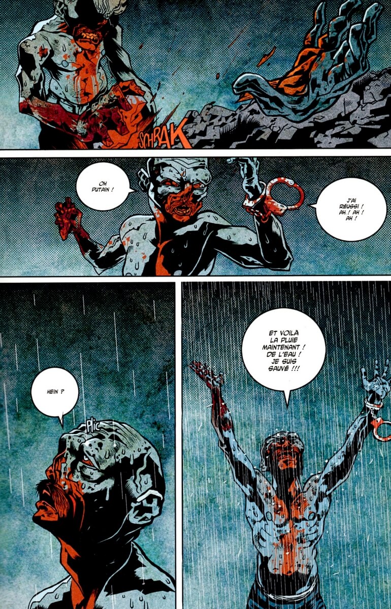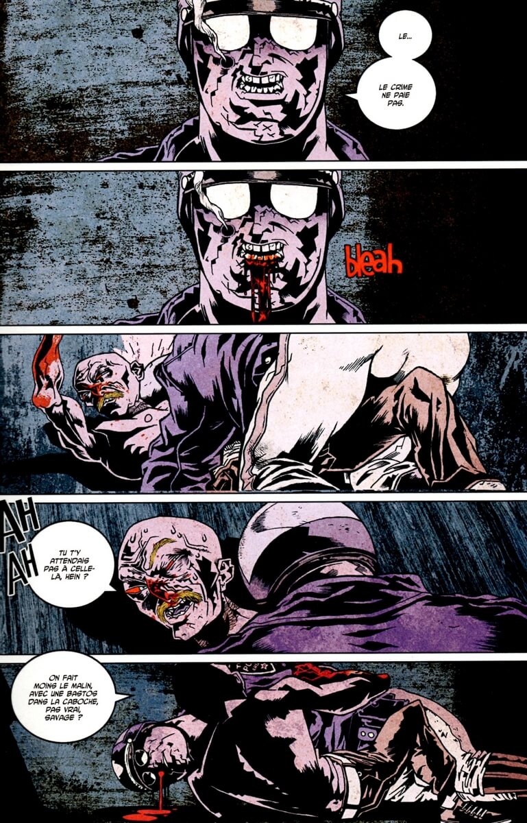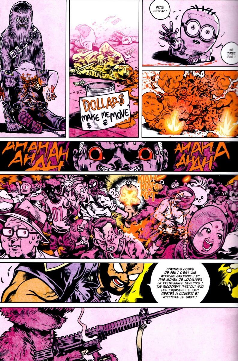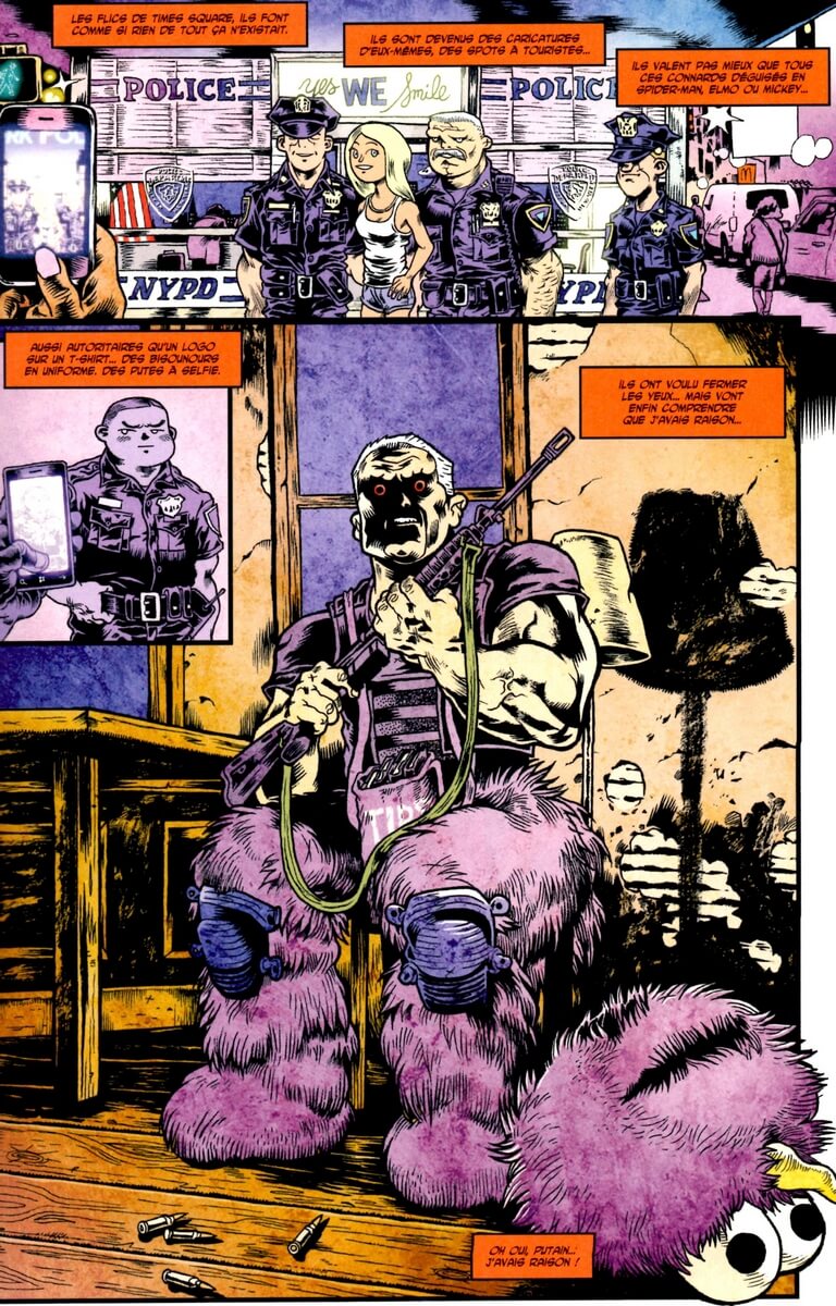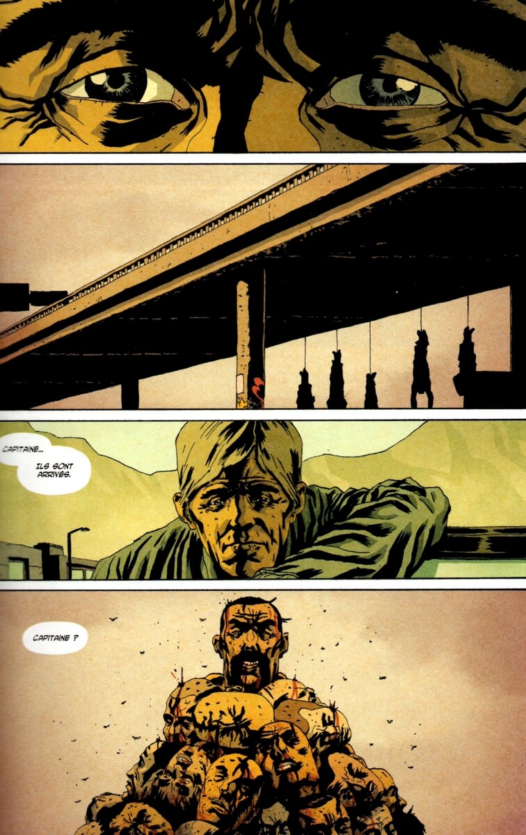 - The Border de Run et Singelin : Trois américains se considérant comme de « vrais » Minutemen, font le ménage en ne laissant passer aucun clandestin mexicain. Il ne faudrait pas que l’un d’entre eux passe la frontière avec « le cul bourré de sac d’héroïne » voire en ramenant des maladies telles « le hache-un haine-un »… Enfants, femmes enceintes, deux de ces miliciens, arborent fièrement les photos de leurs victimes avec ce sentiment du devoir accompli. Nous les suivons ainsi dans cette chasse à l’homme qui ne va pas se dérouler comme prévu. On retrouve le duo Run/Singelin pour une histoire qui fait vraiment froid dans le dos, tant elle pointe du doigt la réalité. À noter, une nouvelle fois, l’excellente prestation graphique de Guillaume Singelin.
