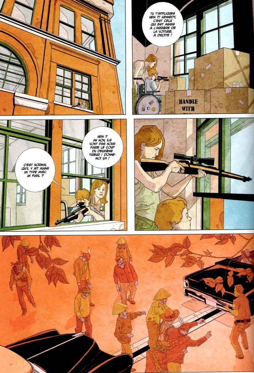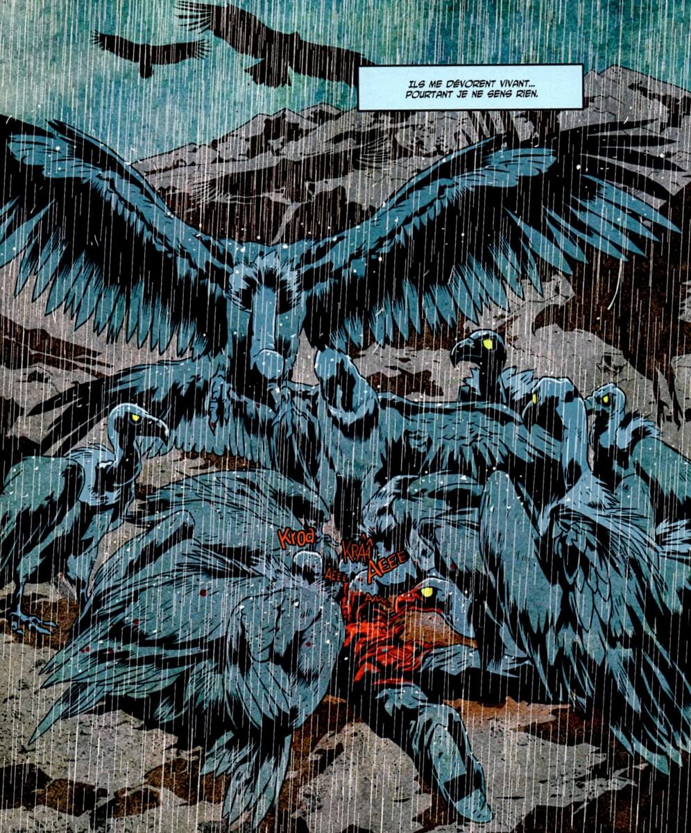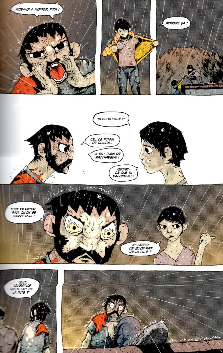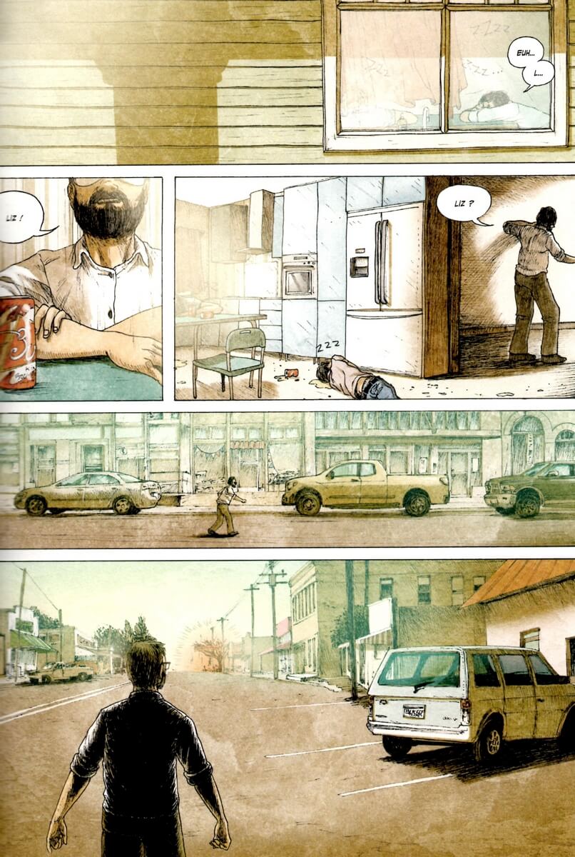 - The Border de Run et Singelin : Trois américains se considérant comme de « vrais » Minutemen, font le ménage en ne laissant passer aucun clandestin mexicain. Il ne faudrait pas que l’un d’entre eux passe la frontière avec « le cul bourré de sac d’héroïne » voire en ramenant des maladies telles « le hache-un haine-un »… Enfants, femmes enceintes, deux de ces miliciens, arborent fièrement les photos de leurs victimes avec ce sentiment du devoir accompli. Nous les suivons ainsi dans cette chasse à l’homme qui ne va pas se dérouler comme prévu. On retrouve le duo Run/Singelin pour une histoire qui fait vraiment froid dans le dos, tant elle pointe du doigt la réalité. À noter, une nouvelle fois, l’excellente prestation graphique de Guillaume Singelin.