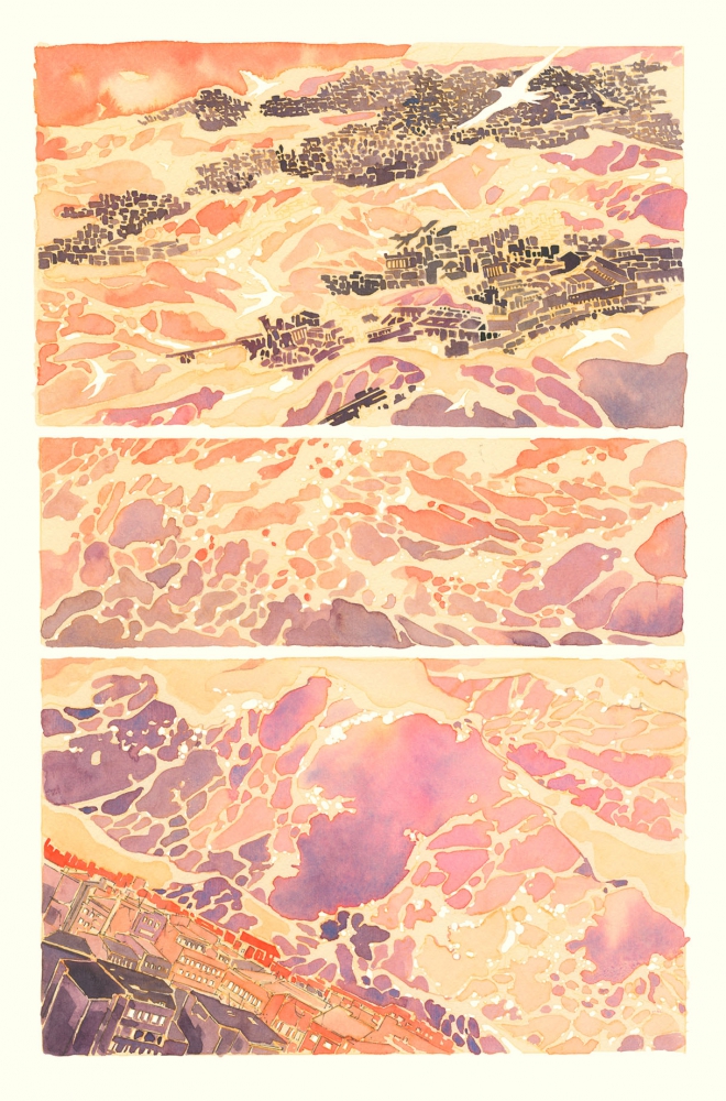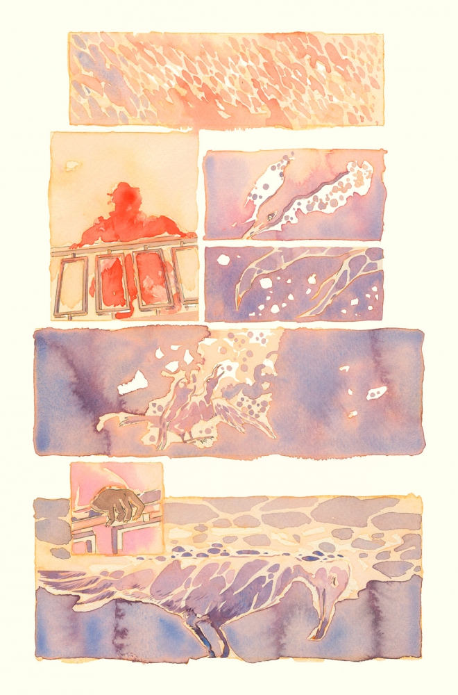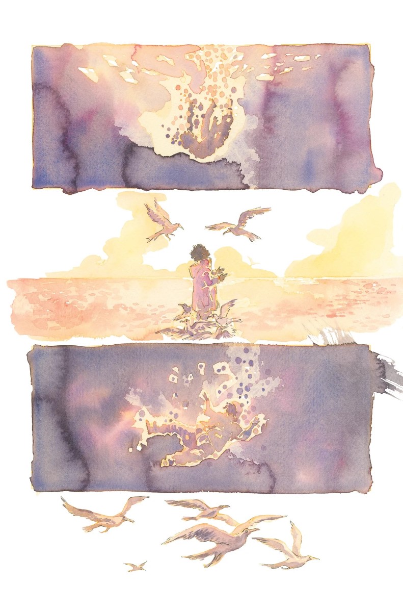 En cohérence parfaite avec l’omniprésence de la mer, Emma Ríos nous livre une œuvre intégralement réalisée en aquarelle. Cette technique offre la fluidité nécessaire aux envolées poétiques, tout en développant une ambiance onirique, parfois éthérée. Aussi adaptée aux scènes terrestres que marines, il faut néanmoins avouer qu’elle prend toute son ampleur sous la surface de la mer dans des tableaux à couper le souffle.