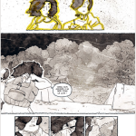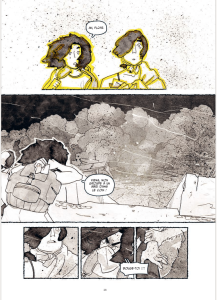 Ces panneaux SNCF, donc, sont aussi symbole d’une force de l’autrice, celle de faire parler ses cadres et décors. Le décor nous place dans le contexte tout autant, si ce n’est plus, que les échanges entre les personnages. Grâce à un découpage maîtrisé, entre pleines pages régulières et corps dépassant des cases, le lecteur est toujours désireux de tourner la page. Les cases, elles, se conjuguent avec l’instabilité de ce monde parti à la dérive, en étant comme légèrement gribouillés.