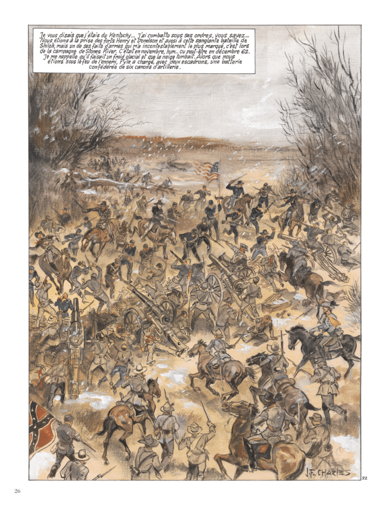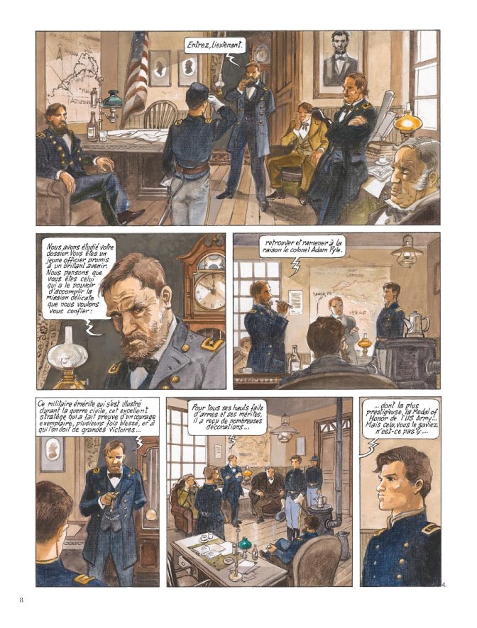 Qu’arrivera-t-il au colonel au terme de cette confession ? On laisse ici le soin au lecteur de découvrir l’épilogue de ce western littéraire, naturaliste, porté par un dessin somptueux. Ici, on parlera plutôt de peinture. Jean-François Charles a en effet utilisé une technique inédite : la peinture acrylique appliquée directement sur le crayonné et sur une toile prévue pour la peinture à l’huile. Résultat : des panoramas grandioses souvent traités en pleines pages, des couleurs et des lumières jetées au pinceau que ne renieraient pas certaines toiles de maîtres. Le paysage ici est aussi un personnage.