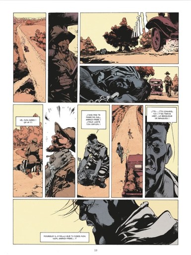 En choisissant une colorisation avec des teintes chaudes, Jérôme Maffre imprègne le dessin avec la chaleur ambiante dans cette ville de Savannah. En jaune et ocre, il matérialise le soleil, mais surtout les températures élevées qu’on ressent présentes, quel que soit le moment de la journée. Le marron et le rouge sont également très forts, surtout quand l’intensité entre les différents clans va à son paroxysme.