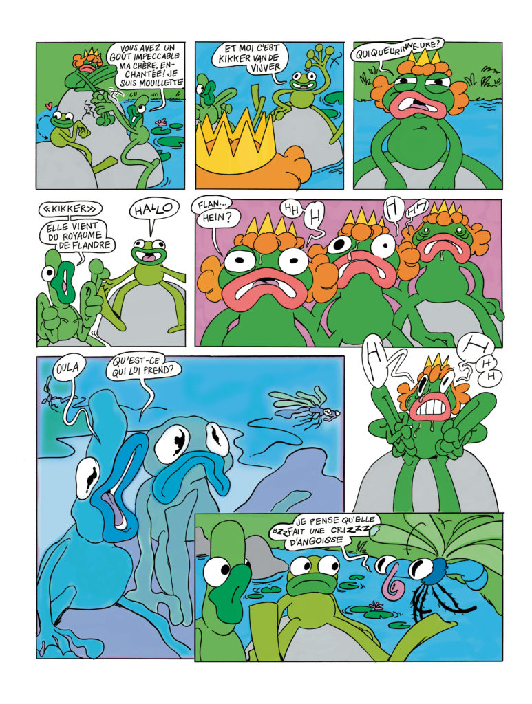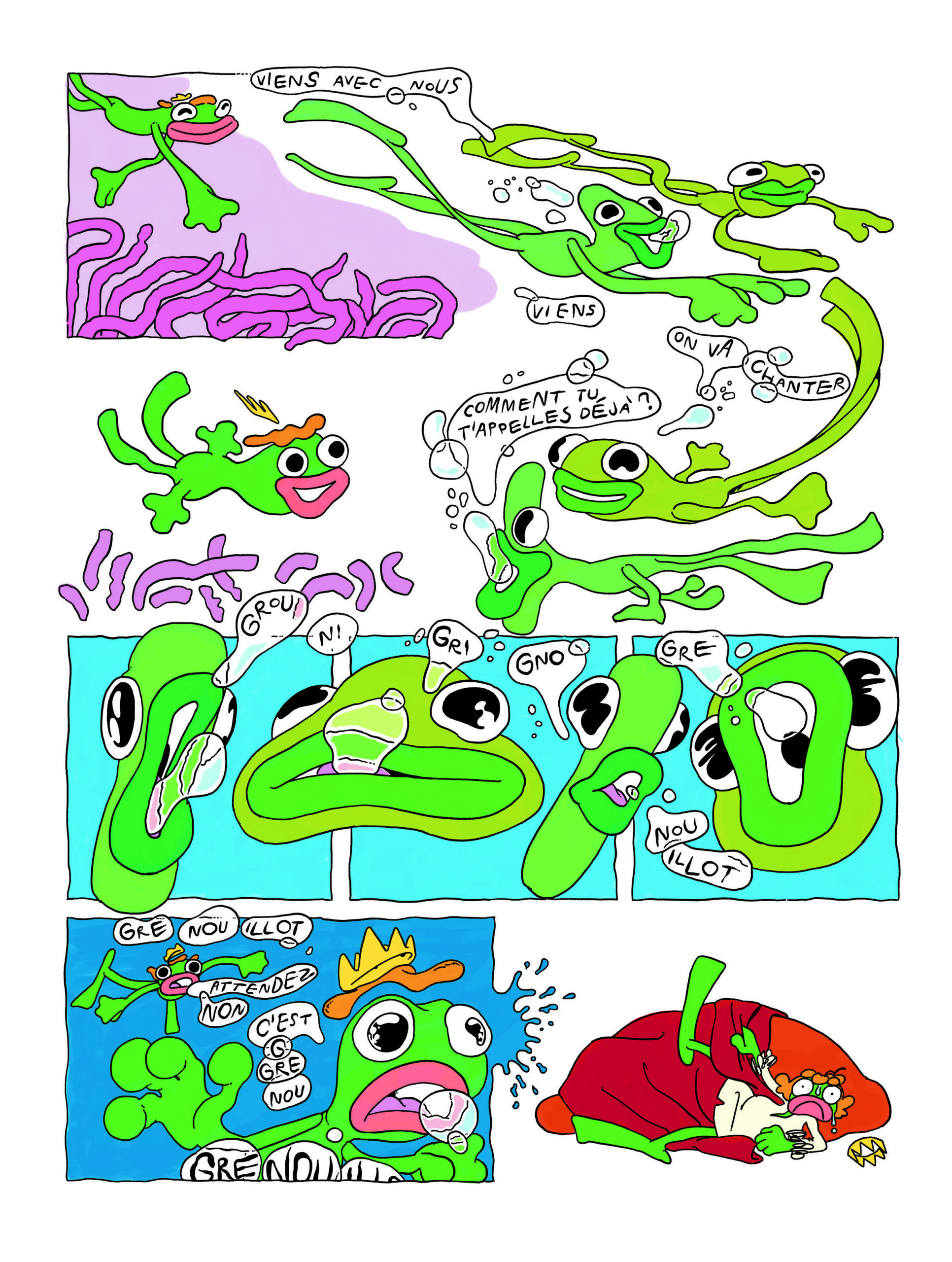 Dans la veine des récits du F’murrr (graphiquement et pour l’humour) et de Vaughn Bodé, Camille Potte trace son chemin parmi ces talentueux ancyens. Influences et confluences, le fleuve n’est pas rectiligne mais permet à l’autrice de parler de notre époque sans grenouiller.