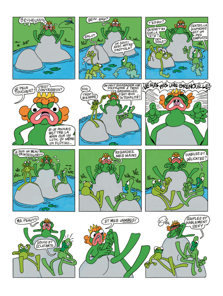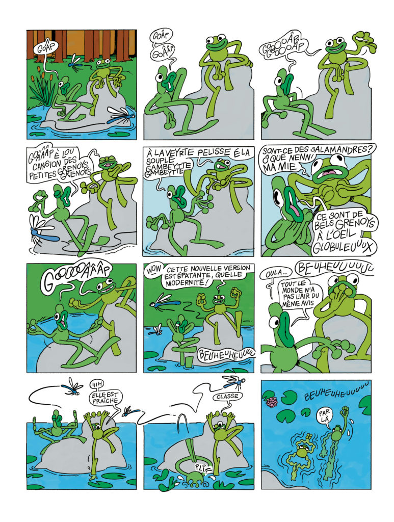 Résumé de l’album : Le Prince Gourignot de Fouët est bien malheureux, et pour cause, le voilà transformé en grenouille. Rien ne l’avait préparé à cet état, ni au complot fomenté dans son dos, dans le but de le destituer. Un seigneur qui tombe, c’est un peu de démocratie qui s’installe… quoique… Pendant ce temps, la valeureuse Gounelle, chevalière de son état, s’en va délivrer la princesse Patin à la peau d’albâtre et affronter le dragon qui la garde, mais pour elles deux, le chemin du retour sera bien long, sinueux, semé d’embûches, mais aussi de découvertes. Si l’on rajoute une salamandre hallucinée, une sorcière acariâtre, un ménestrel insupportable et des grenouilles mélomanes, on commence à avoir une petite idée de la folie pure qu’est Ballades, le premier livre de Camille Potte, et on vous le dit comme on le pense, assurément un des livres les plus drôles et attachants de l’année.
