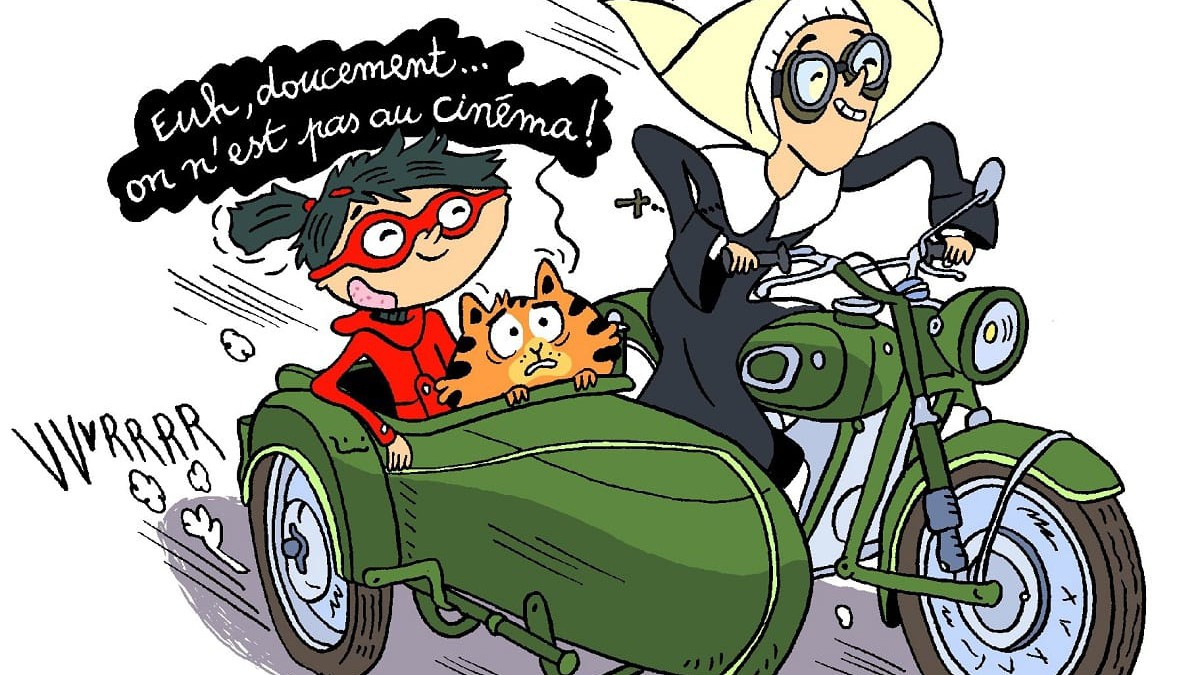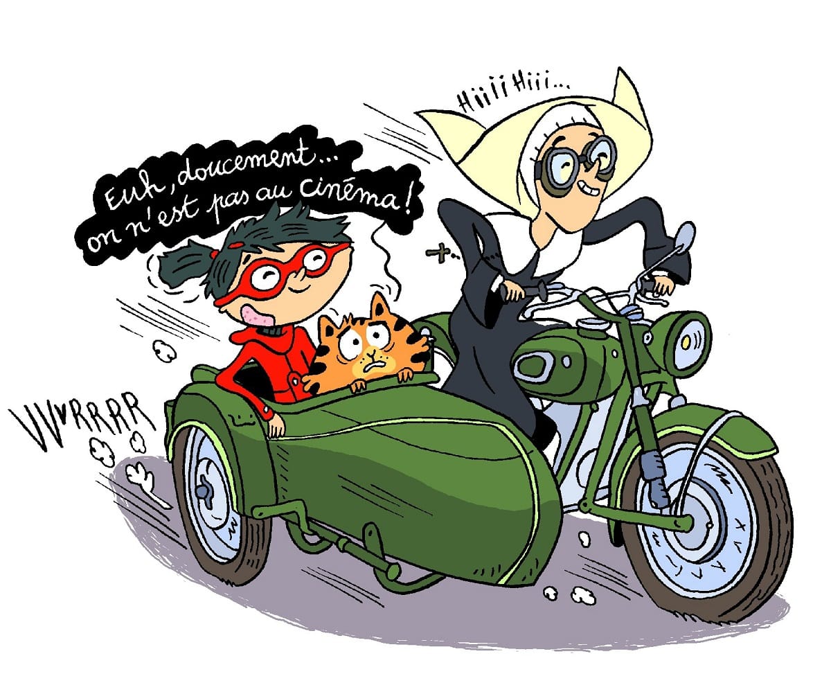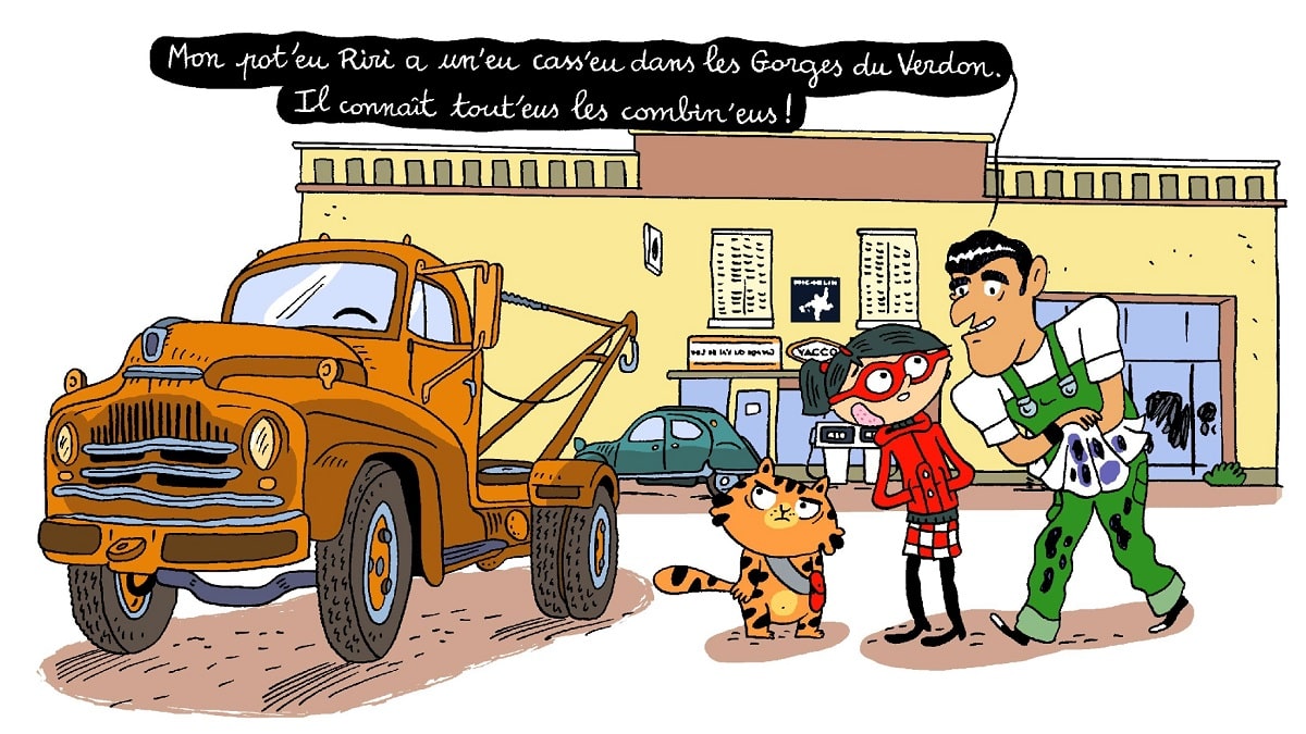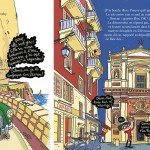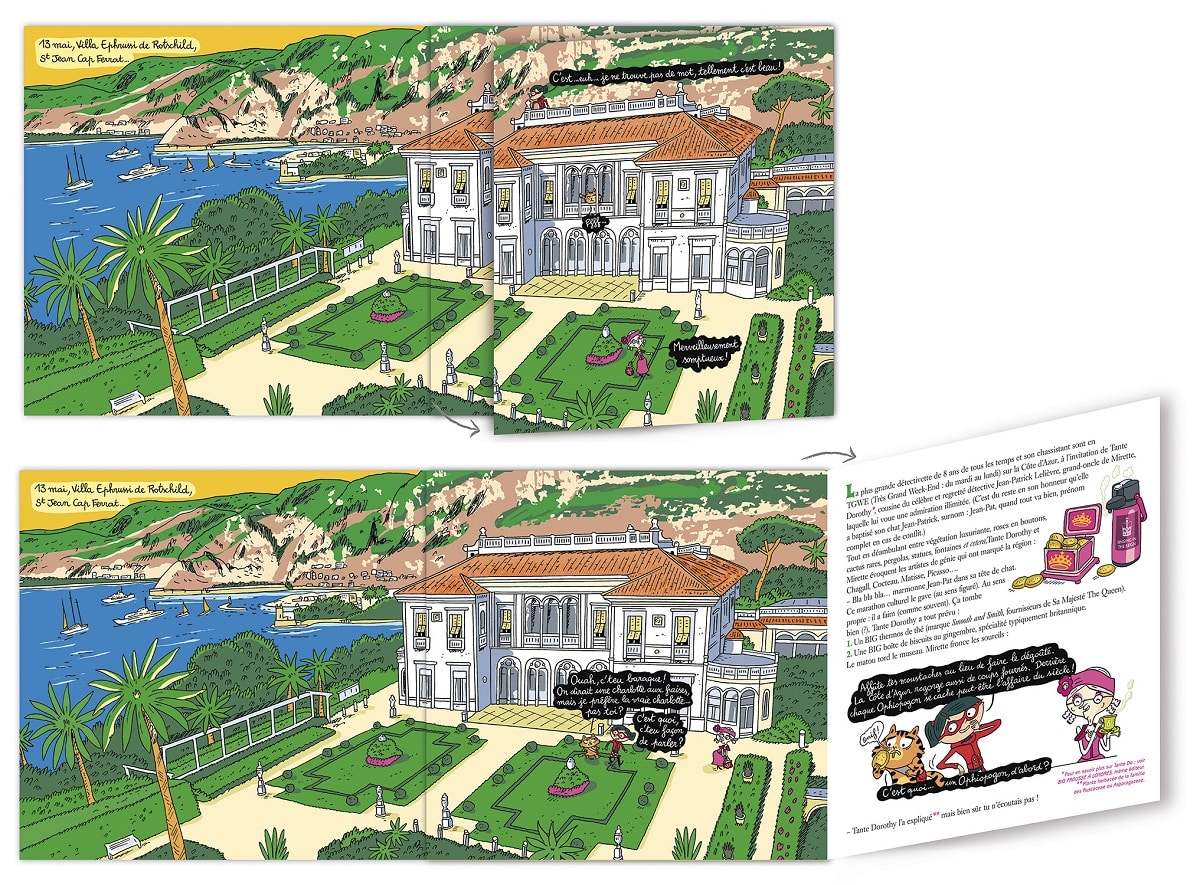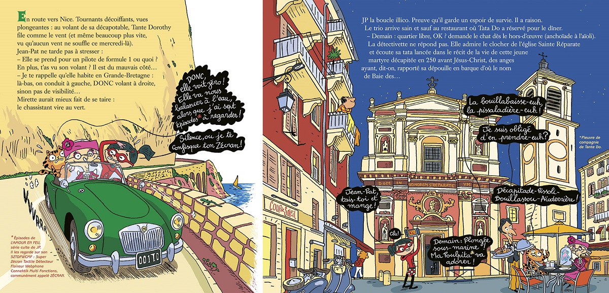 Direction la Côte d’Azur pour Mirette et Jean-Pat. Comme pour les précédentes enquêtes, nos deux héros se rendent dans des lieux emblématiques européens (Londres, Barcelone, Venise ou Rome) mais aussi en France (Paris ou la Bretagne, pour l’avant-dernier). Pour son récit, comme pour les volumes antérieurs, Fanny Joly déploie tout son talent pour conter une histoire folle et rythmée, non dénuée d’humour et toujours intelligente. Il faut souligner que la scénariste est une romancière reconnue dans l’édition jeunesse (La fée Baguette, 19 titres chez Lito, Les P’tits soucis, 8 titres chez Hachette ou Cucu la praline, 5 titres chez Gallimard). Dans cette nouvelle enquête, elle met en scène une intrigue (plutôt classique) dans le Sud-Est de la France. La toile de fond géographique est la Côte d’Azur et elle emmène ses deux héros dans les villes les plus connues de cette magnifique région : Saint-Jean Cap-Ferrat, Nice, Juan les Pins, Saint-Paul de Vence, Grasse (une belle scène dans l’univers des parfums), Verdon, Saint-Tropez, Porquerolles ou Cannes. Ainsi, Mirette et son chassistant visitent la région en menant leur enquête (et les jeunes lecteurs aussi). On les retrouve sur les ports de ces stations balnéaires (Saint-Tropez) ou dans les rues animées des villes dans les terres (Nice).