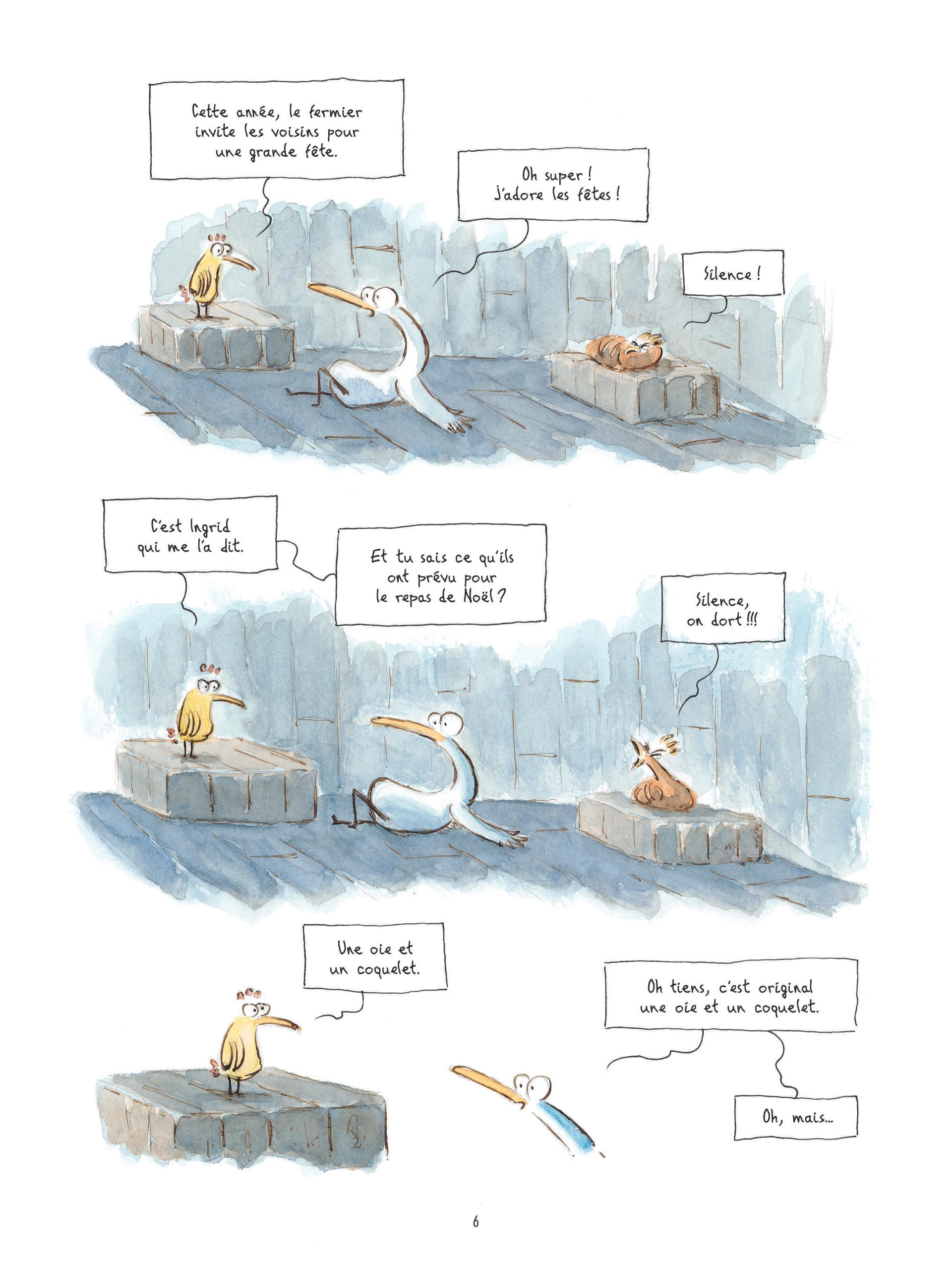 Résumé de l’album : Betty et Polo sont des animaux de ferme. Ils appartiennent à l’échelon le plus bas dans la hiérarchie des animaux : les fonds de bouillons, ceux destinés à finir dans une assiette. Bien décidés à ne pas garnir la table du réveillon, ils parviennent à s’enfuir juste avant Noël, et découvrent qu’il existe une école pour devenir de parfaits animaux de compagnie.