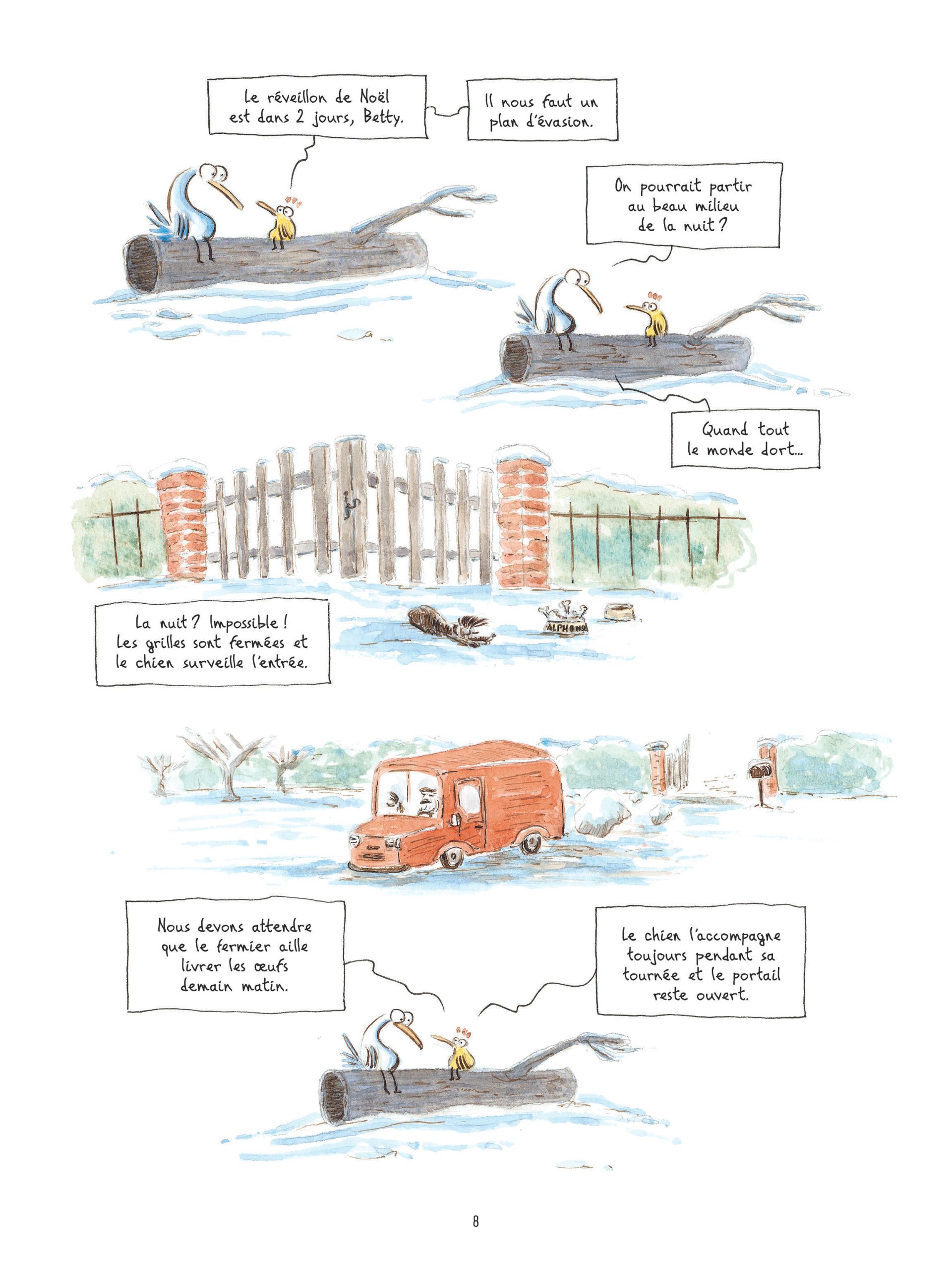 En lisant Betty et Polo, on pense tout de suite à Chicken Run, le film d’animation de Dreamworks de 2000, mais également du Grand méchant renard ou Un bébé à livrer, les merveilleuses bandes dessinées de Benjamin Renner. Excusez du peu, mais ce sont d’excellentes références. Parce que oui, l’album d’Adrien Poissier se glisse avec délice dans les pas de ces deux œuvres. Bien évidemment que Betty et Polo n’est pas aussi fort que ses deux prédécesseurs mais c’est un récit où l’on passe un super moment de lecture et où on rigole beaucoup.