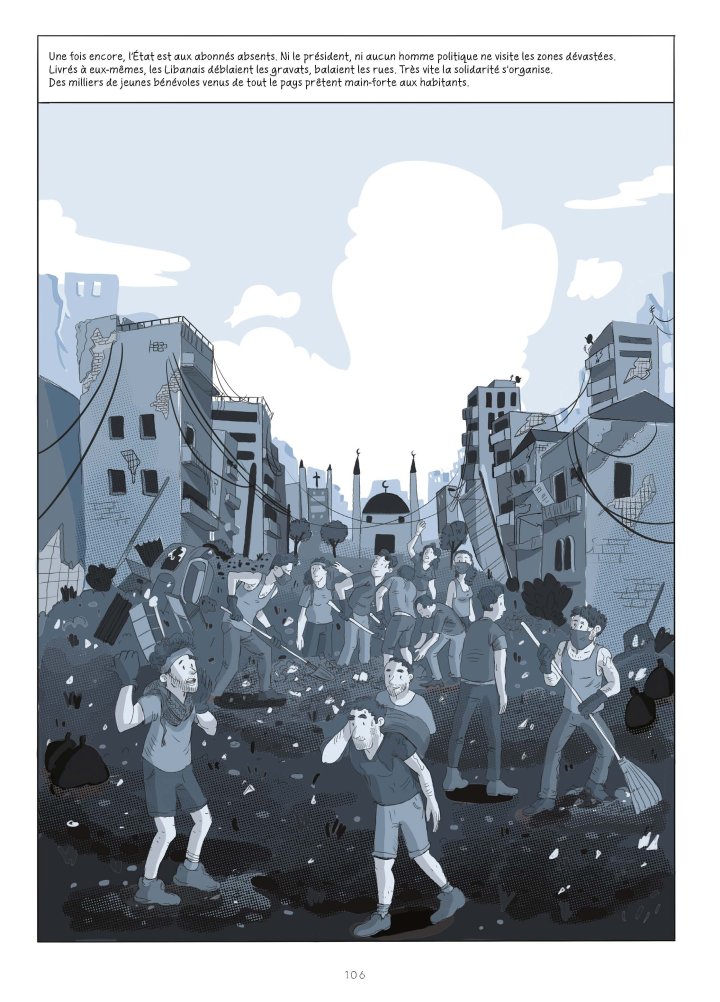 Portée par le dessin clair et sensible de Kamal Hakim, cette histoire reste celle d’un pays profondément inégalitaire, secoué à intervalles réguliers par de multiples crises. Basé sur un modèle ultra-libéral soutenu par les banques et le tourisme pour attirer les capitaux des pays du Golfe, le Liban est en souffrance. Au fil des pages, les autrices distillent chiffres et données qui permettent de mieux comprendre ce qui se joue dans un pays où 1 % de la population détient 40 % des richesses ou encore que 85 % de l’offre médicale est privée… Le quotidien devient lourd à assumer quand tout ou presque, vient à manquer. « On veut un État digne de ce nom ! lance une manifestante. On veut de l’électricité 24 h/24. De l’eau potable, moins de pollution, des transports en commun, des services publics ».