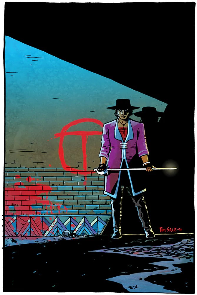 Bien entendu, certaines sautent aux yeux. C’est le cas lorsque Tim Sale se prend lui aussi au jeu et s’inspire de Zorro pour représenter notre héroïne. De la même manière, l’initiale peinte sur les murs de la ville en signe de révolte rappelle visuellement V pour Vendetta d’Alan Moore. Mais d’autres éléments sont bien moins manifestes et relèvent par exemple de la construction shakespearienne de l’intrigue. Enfin, comment ne pas esquisser un sourire face aux répliques de certains personnages, inspirées de Cervantès ou même de Star Wars. Du clin d’œil feutré à la référence explicite, chaque page ou presque réserve son lot de surprises.