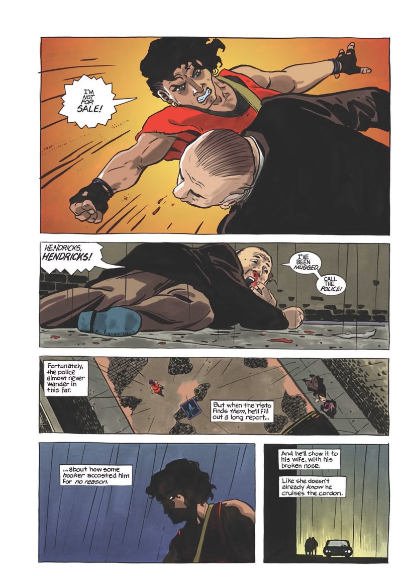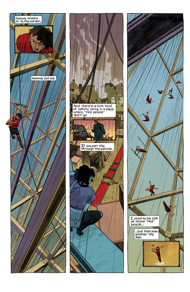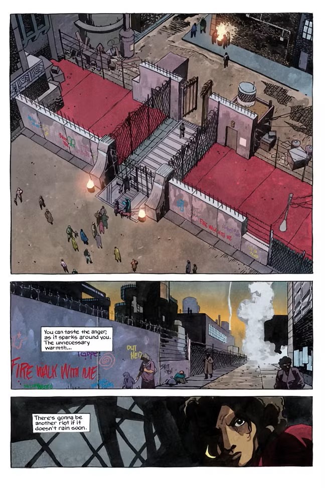 Scénarisée par Sarah Byam, Billi 99 est une uchronie sociale qui met en lumière les opprimés. Ceux qu’un monde devenu encore plus capitaliste méprise et exploite. Bien entendu, le sujet n’est pas des plus originaux. Pour autant, porté par une narration très fluide et de nombreuses références parfaitement assumées, l’histoire nous emporte aux côtés de la courageuse Billi. Ainsi, l’aventure se déroule à Sulter, une mégalopole fictive qui pourtant, par bien des aspects, rappelle la ville de Detroit que l’autrice ne connaît que trop bien, puisqu’elle y était lorsqu’éclatèrent les émeutes sociales de 67. Et au milieu de ces événement politiques, la scénariste s’amuse à incorporer des références culturelles.