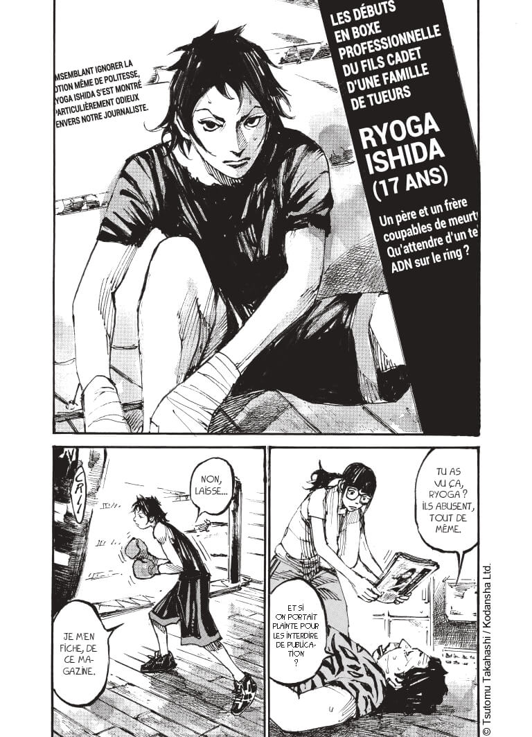 Résumé de l’éditeur : Fils de meurtrier, tueur présumé, mais surtout boxeur prêt à tout pour arriver au sommet. Un père en prison pour meurtre, un grand frère arrêté pour le même motif : Ryoga Ishida fait partie d’une «famille de tueurs». Malgré l’agitation des médias qui le soupçonnent d’être lui aussi un assassin, Ryoga s’accroche à son talent et aux lettres que lui envoie son père pour faire ses premiers pas en tant que boxeur professionnel. Son but ? Devenir le plus grand des champions.