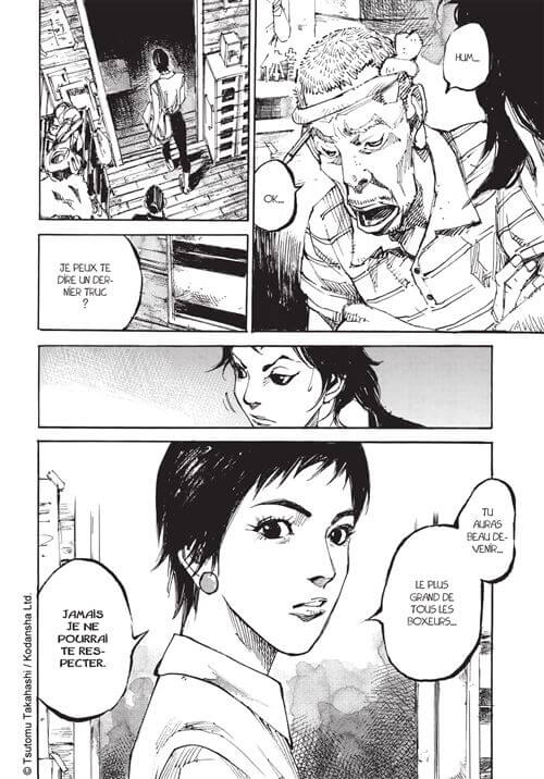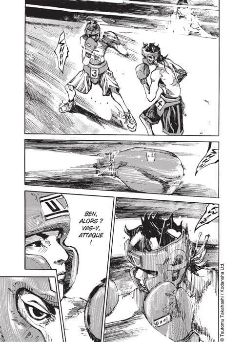 Tsutomu Takahashi dévoile un seinen âpre qui met en scène un adolescent solitaire, écorché vif et qui n’a d’yeux que pour la boxe. On apprécie beaucoup les ambiances des salles d’entrainement comme celles des combats mises en image par l’auteur de NeuN. S’il est détestable et misanthrope, on est quand même attiré par ce bad boy. On aimerait en connaître plus sur lui ; aller au-delà de cette carapace et de cette envie de boxe. Il y a une vraie aura qui entoure ce personnage.