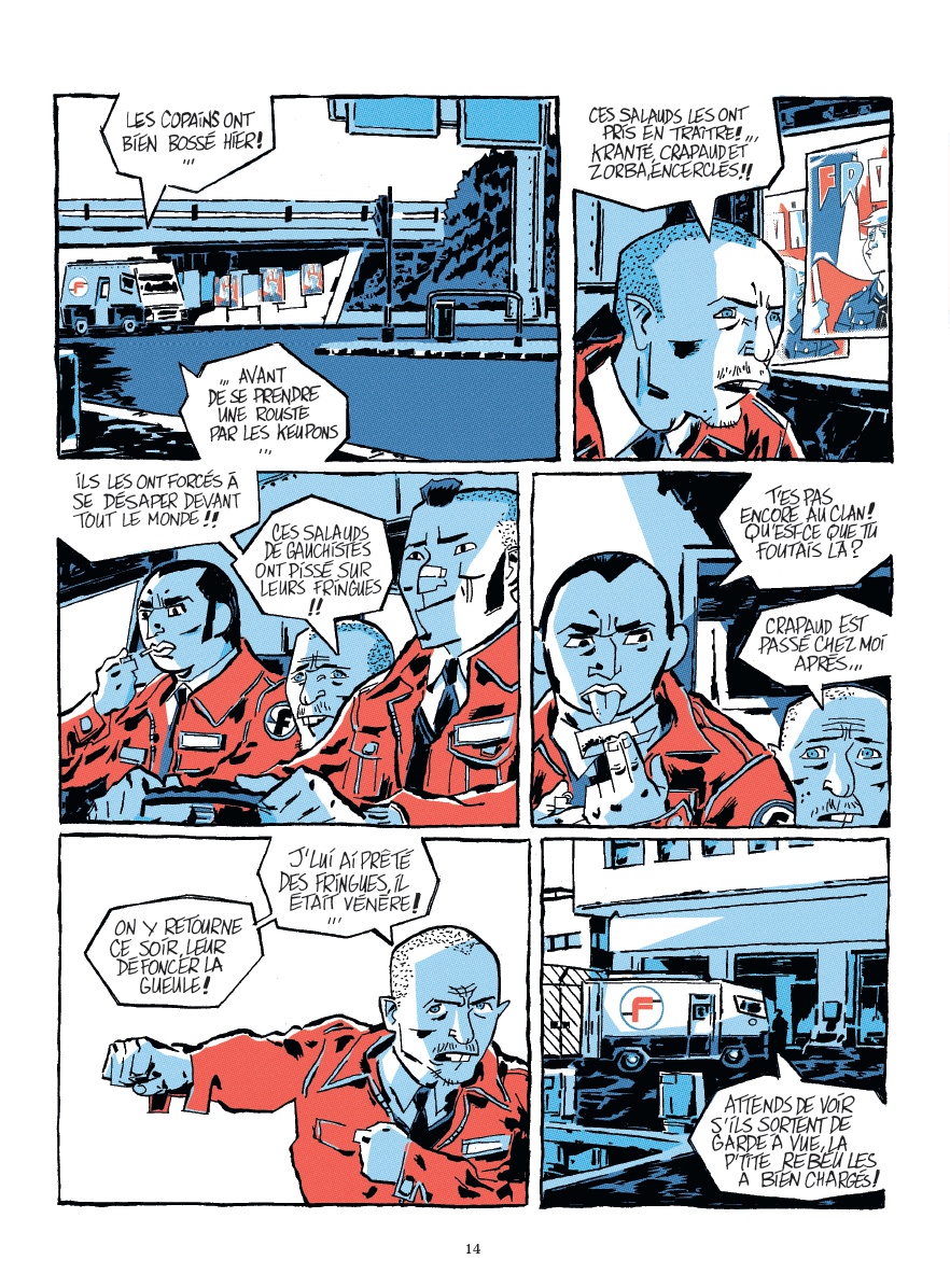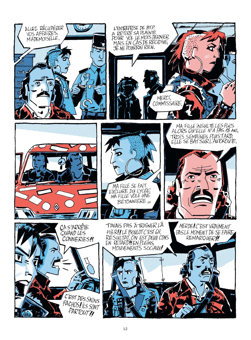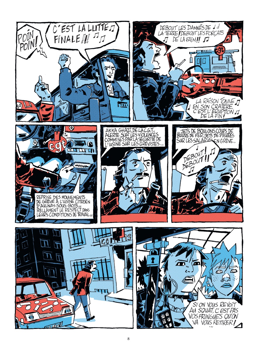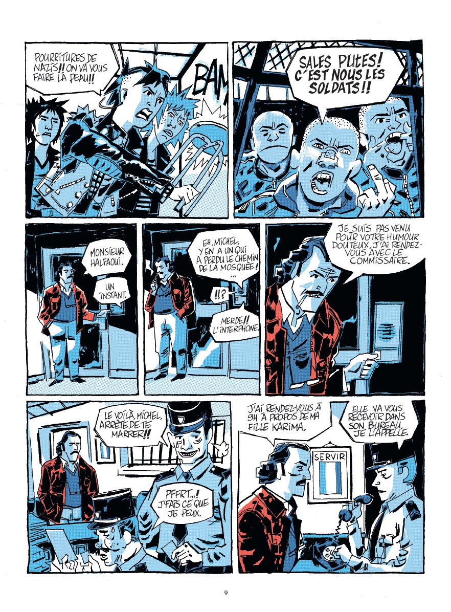 Résumé de l’éditeur : Début des années 1980, une grève éclate à l’usine Citroën d’Aulnay-sous-Bois. Ouvrier issu de l’immigration marocaine, Ahmed Halfaoui est aussi un fervent syndicaliste CGT qui mène un âpre combat pour sensibiliser le gouvernement et les médias sur les conditions des travailleurs. Pendant ce temps, sa fille Karima, arborant une crête punk, se retrouve mêlée à des affrontements avec des groupuscules d’extrême droite et les skinheads prêts à en découdre. En colère, suspendue aux paroles des Bérurier Noirs à une époque où la vague punk rock déferle, elle essaie de concilier travail à l’usine, militantisme et entraînement à la boxe. Mais la haine gagne du terrain dans sa cité, et la lutte sociale se heurte à une recrudescence de la violence raciste et sexiste. Tout bascule quand Karima et son père se rendent à une manifestation. Ce jour-là, un groupe d’individus, dont un certain Sergio, infiltrent le service de sécurité du cortège… Très vite, la situation dégénère et Ahmed est grièvement blessé. Tandis que la police classe l’affaire sans suite, Karima décide de mener sa propre enquête. Il se pourrait bien que certains politiciens rémunèrent dans l’ombre des milices pour ce type d’opération… Mais de là à prouver le lien entre milices, sécurité privée et politique, il y a un gap. Bientôt, chacun devra assumer les responsabilités de ses actes. Le déchaînement de violence pourrait faire des victimes innocentes dans une France où la jeunesse oscille entre colère et espoir…