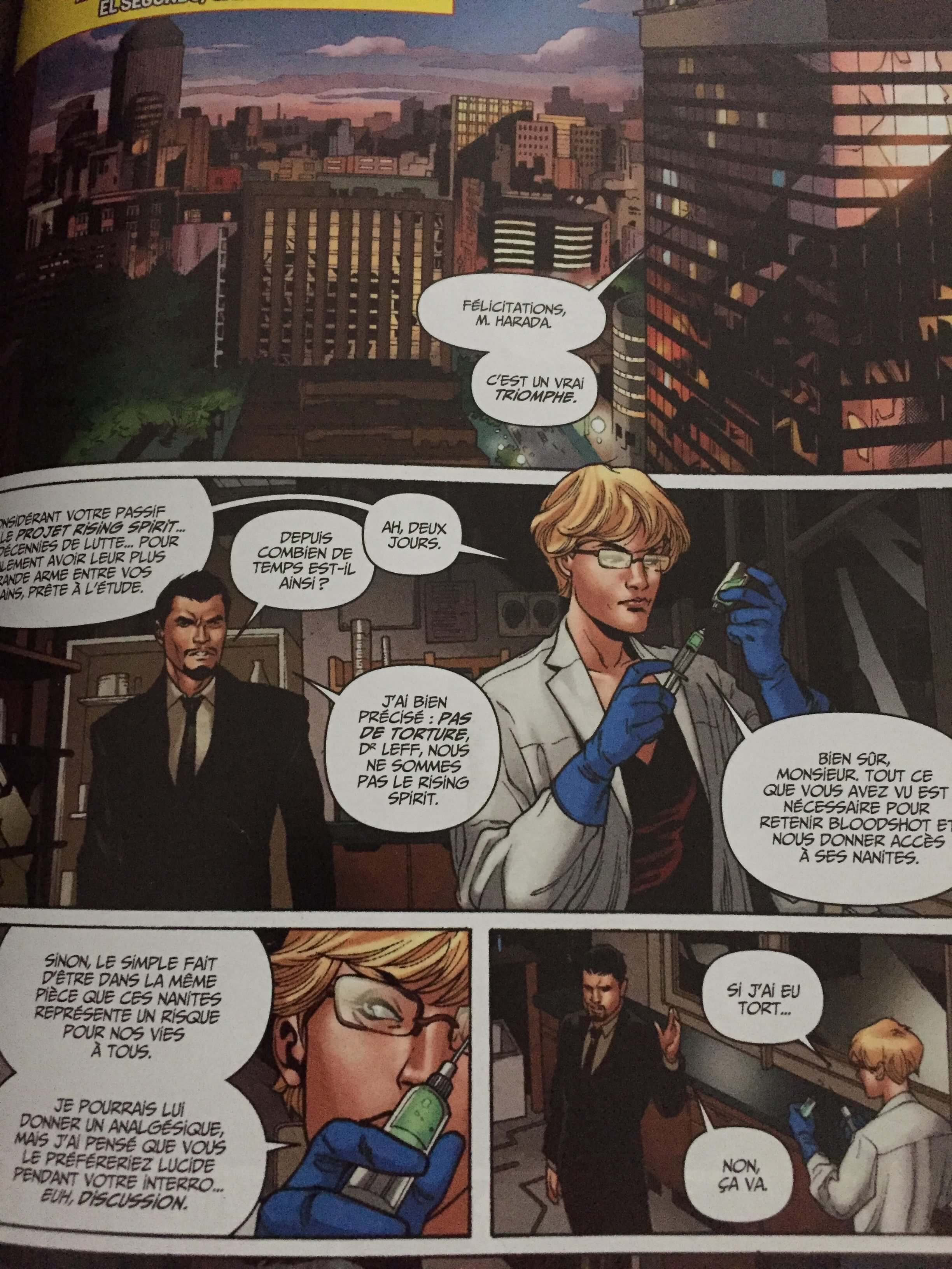 Résumé de l’éditeur : Tu n’as pas de nom. Ils t’appellent Bloodshot, mais les voix dans ta tête t’appellent »papa », »monsieur », »commandant », »camarade »… Ce que tu as besoin d’entendre pour faire le boulot. Mais après tant de missions et tant de morts, tu es enfin prêt à te confronter à l’organisation qui te manipule, le Projet Rising Spirit, et découvrir qui tu es. Fais vite, car tes anciens maîtres n’apprécient pas lorsqu’une arme de plusieurs milliards de dollars se rebelle. Et où que tu ailles, tu peux être certain que la mort et la désolation te suivra…