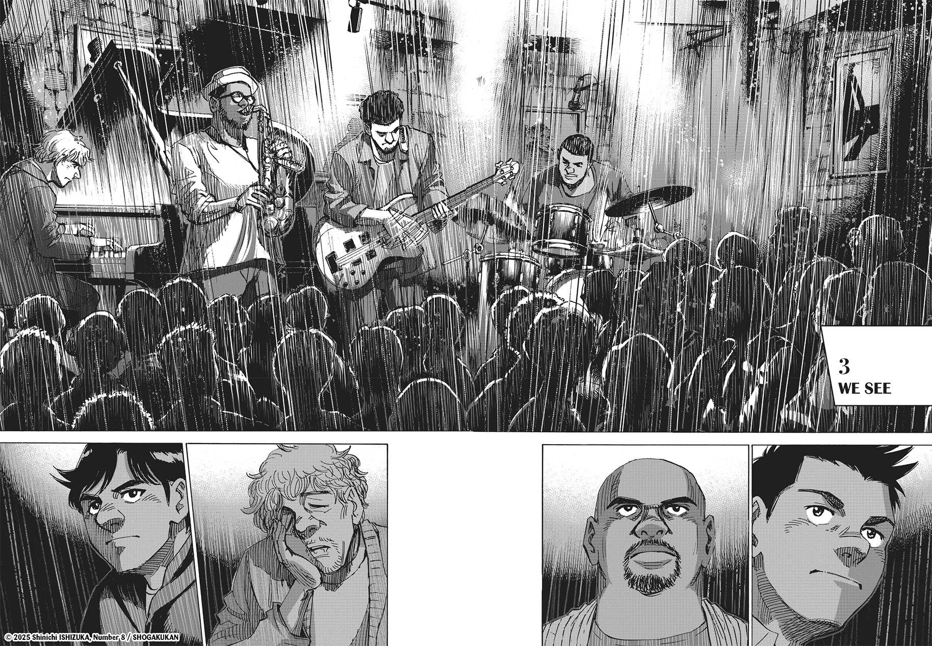 Blue Giant est une suite de série qui se démarque par sa matérialisation de la musique. Shinichi Ishizuka parvient, en quelques traits, à donner vie à ses morceaux. Il réussit même l’exploit, par moment, de donner à entendre ses planches. Chaque ligne est une note, chaque mouvement donne une intensité à sa mélodie. Les cases sont plus ou moins grandes en fonction de l’importance de l’instrument. Tout est particulièrement bien réfléchi et pensé pour nous donner l’impression, en quelques pages, d’assister à un véritable concert.