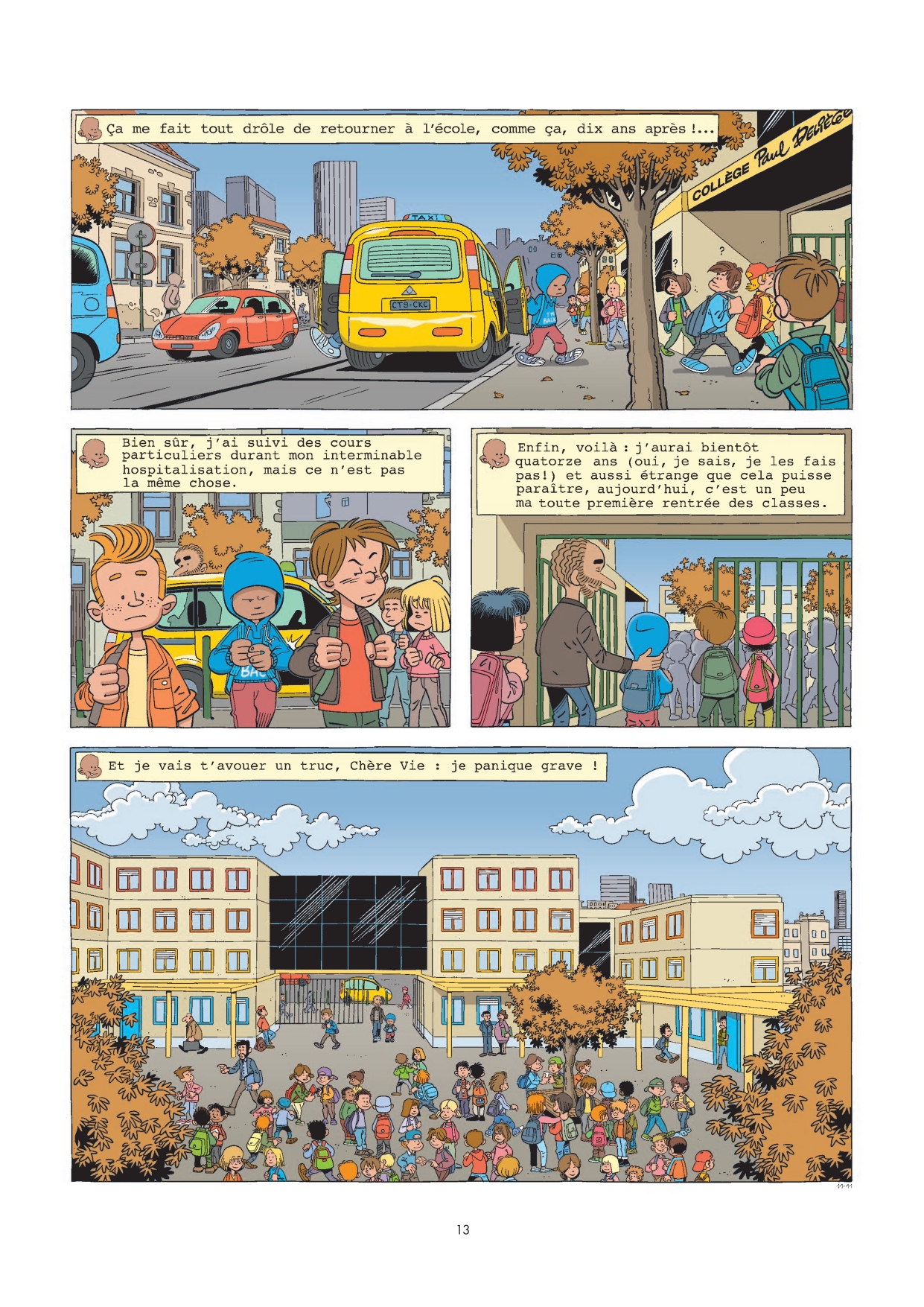 Oui, Zita grandit, elle change. C’est cette évolution qu’explore le scénariste dans ce onzième tome. Il a pris le risque de la faire sortir de son hôpital, du cadre sécurisant pour elle et pour celui qui l’écrit. C’est un tout nouvel environnement que le personnage investit. Un monde bien connu de l’ancien instituteur Zidrou, l’école.