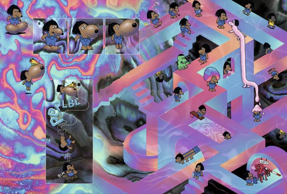 Résumé de l’éditeur : L’heure est grave, et le Mage Pueblo le sait : la Boule de Feu qui alimente leur barrière magique s’étiole et perd chaque jour de sa puissance. Les terribles Maruflans rôdent, et le village sera bientôt à leur merci ! Seul le Sage Patrix peut encore les sauver, mais celui-ci a été exilé, il y a fort longtemps, dans le monde lointain des humains… Bravant les dangers du portail inter-mondes, c’est le fidèle Fernando qui ira chercher le Sage. Didier, sa moustache, et son petit chien Rocky pourront-ils l’aider dans sa quête ? Prisonniers de la cruelle Reine des Chevoules, perdus dans les brouillards des Marais de Morve, Fernando et le Mage Pueblo parviendront-ils à sauver leur village ? Rocky et Didier reverront-ils leur coquet appartement ? Vous le saurez en lisant Boule de feu, le nouveau livre d’Anouk Ricard et Etienne Chaize ! La bande dessinée a souvent accueilli les expérimentations graphiques détonantes et Boule de Feu porte haut cette tradition. Corben et Druillet n’ont qu’à bien se tenir : rarement alliance aussi inattendue n’avait dynamité à ce point les codes graphiques du 9ème Art – et nos rétines ! Anouk Ricard fournit personnages absurdes et dialogues ubuesques avec une facilité déconcertante, mariant à merveille héroïsme et humour, avec deux grands H. Etienne Chaize, jonglant avec les techniques – collages, encres, peinture numérique – fait des miracles et crée les décors de ce monde surprenant, nourri par Le Seigneur des Anneaux, les cartes Magic et autres classiques du genre… Inclassable, drôle et déjantée : Boule de feu est assurément la quête d’héroïc-fantasy la plus brillante de ces derniers années !