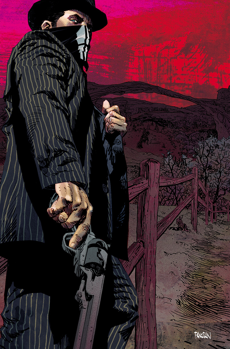 Très à l’aise dans cet univers, le dessinateur réalise une prestation de grande qualité. Soucieux de donner une coloration de western, il construit habillement ses planches, variant à l’envie les plans, à l’image des grands films du genre. Dans le même ordre d’idées, le jeu de champ, contre-champ alimente un suspense haletant qui rend la lecture particulièrement agréable. Saluons enfin le travail exceptionnel réalisé sur les fonds. Conscient de leur importance dans l’immersion, Dave Panosian y porte un soin particulier. Variant les textures et les techniques, mais presqu’uniquement dans les tons jaunes, il nous plonge dans ce Far West oppressant et étouffant, où règne une odeur de soufre.