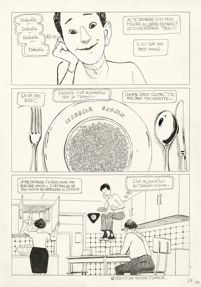 Résumé de l’éditeur : Pascal Rabaté adapte le récit autobiographique de François Morel dans une BD drôle et poétique. On n’est pas sérieux quand on a douze ans. On tombe amoureux. Isabelle Samain. Son nom est un refrain, sa beauté, une chanson d’amour. On la guette, on se pâme, on fantasme, on la désire. C’est aujourd’hui que je vous aime est un récit autobiographique. François Morel est « tous les garçons de cet âge ». Le comédien nous raconte les amours débutantes, balbutiantes et gauches, désespérées et hilarantes.