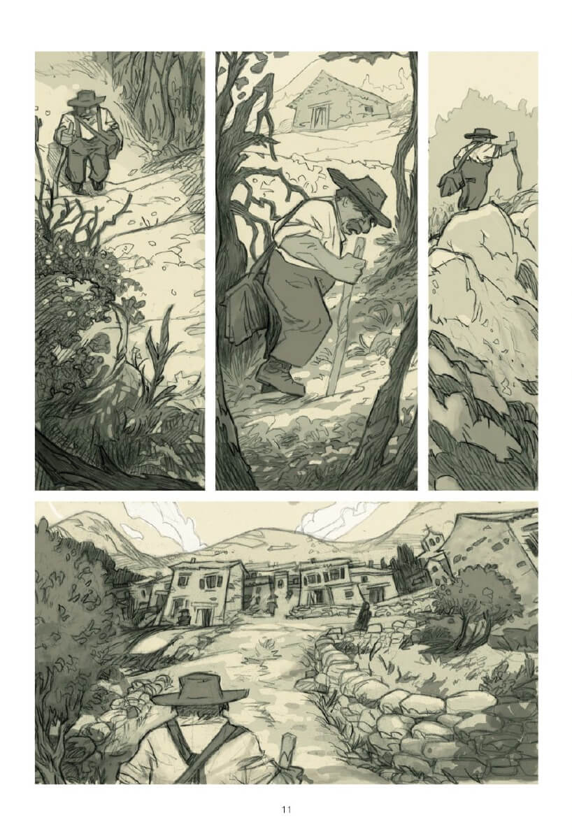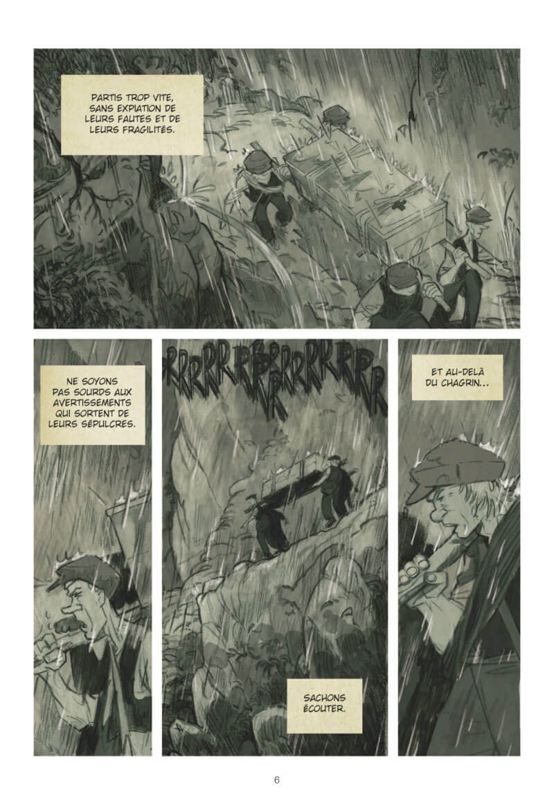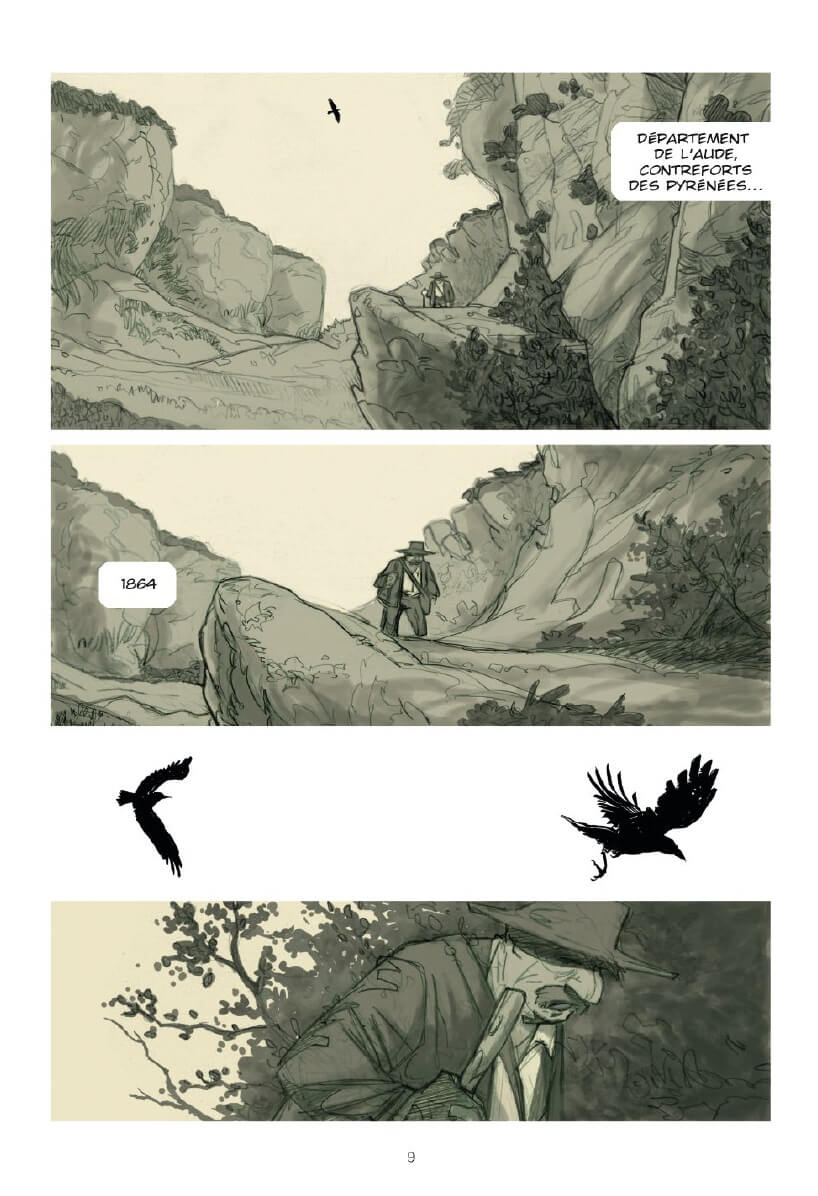 Ce qui aurait pu ressembler à un portrait enchanteur des Pyrénées glisse vers le drame à partir du moment où l’on descend le cercueil vers la Pause des morts, un lieu qui existe vraiment. D’ailleurs le scénariste s’est inspiré de faits réels pour broder Charogne : « Le village dépeint dans la bande dessinée est réellement situé dans le département de l’Aude sur un territoire appelé le pays de Sault. C’est là que sont racontées les histoires qui ont initié cette fiction… », comme il l’explique dans la postface.