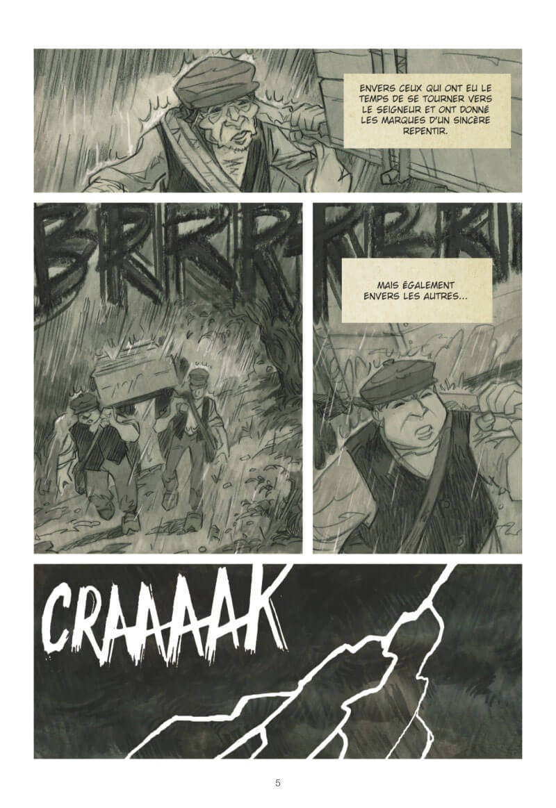 Résumé de l’éditeur : Sa mort va leur faire vivre un enfer. Quelque part dans un petit village de montagne en Provence. Le maire Joseph, homme bienfaiteur et aimé de tous, vient de mourir. Comme il est du devoir du peuple de lui donner un dernier adieu digne de ce nom, quatre hommes sont missionnés pour transporter le cercueil auprès du curé afin qu’il donne sa bénédiction. Mais ce ne sera pas une partie de plaisir. La route pour l’église est difficile, elle passe par des chemins de montagne escarpés, ce qui attise les rivalités au sein du groupe. En plus du poids mort, le cortège funèbre semble aussi traîner son lot de lourds secrets. Et lorsque les éléments s’en mêlent, la tension déjà palpable devient électrique. Le dernier voyage de Joseph pourrait aussi bien être le leur…Ce polar rural, haletant comme Le Convoi de la peur et âpre comme un roman de Giono, nous emmène dans un périple où la mort et le poids de la culpabilité n’épargnent personne. Boris Joly, jeune talent plus que prometteur, impressionne par sa maîtrise narrative et son dessin d’une grande maturité, incarnant à merveille les gueules et les dialogues ciselés de Benoit Vidal.