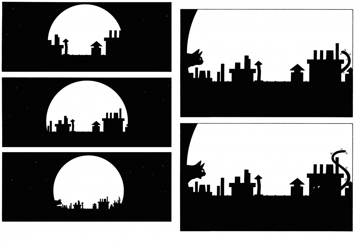 La lune éclaire une nuit sans nuage. A la lueur de l’astre, un chat se promène sur les toits d’une ville. Il croise alors une très jolie chatte.