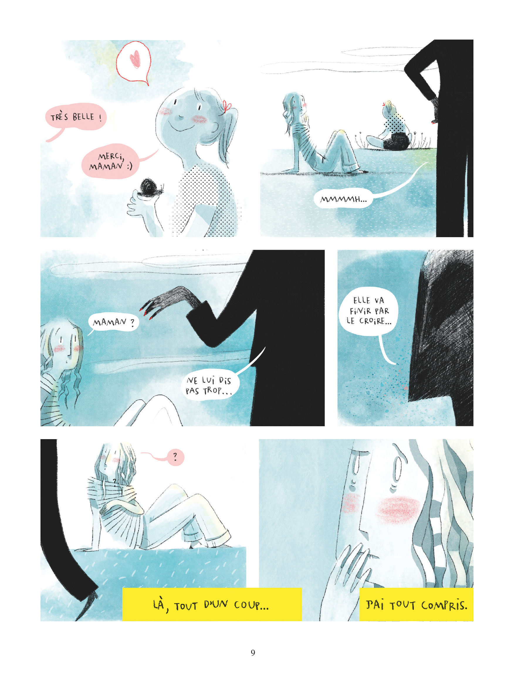 Les propres enfants d’Alice, s’ils ne mettent pas les mots sur ce que vit leur maman, dessinent son fardeau. Un jour, la petite fille dessine « Maminoire », comme une ombre menaçante planant au-dessus de la famille. C’est d’ailleurs ainsi que Mlle Caroline a dessiné la mère castratrice. Une silhouette noire, anonyme, sans traits…