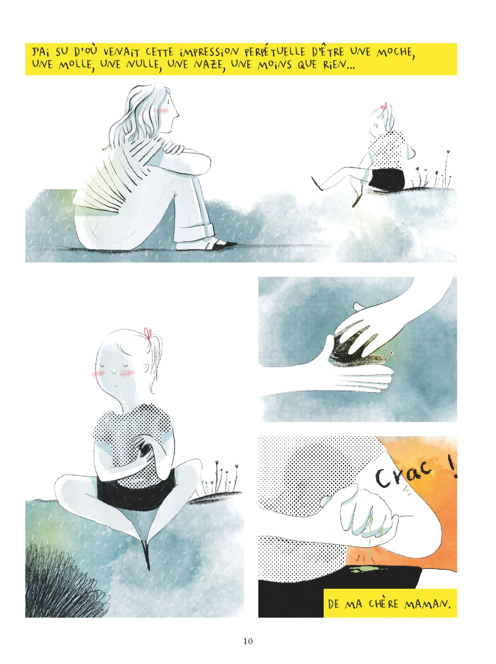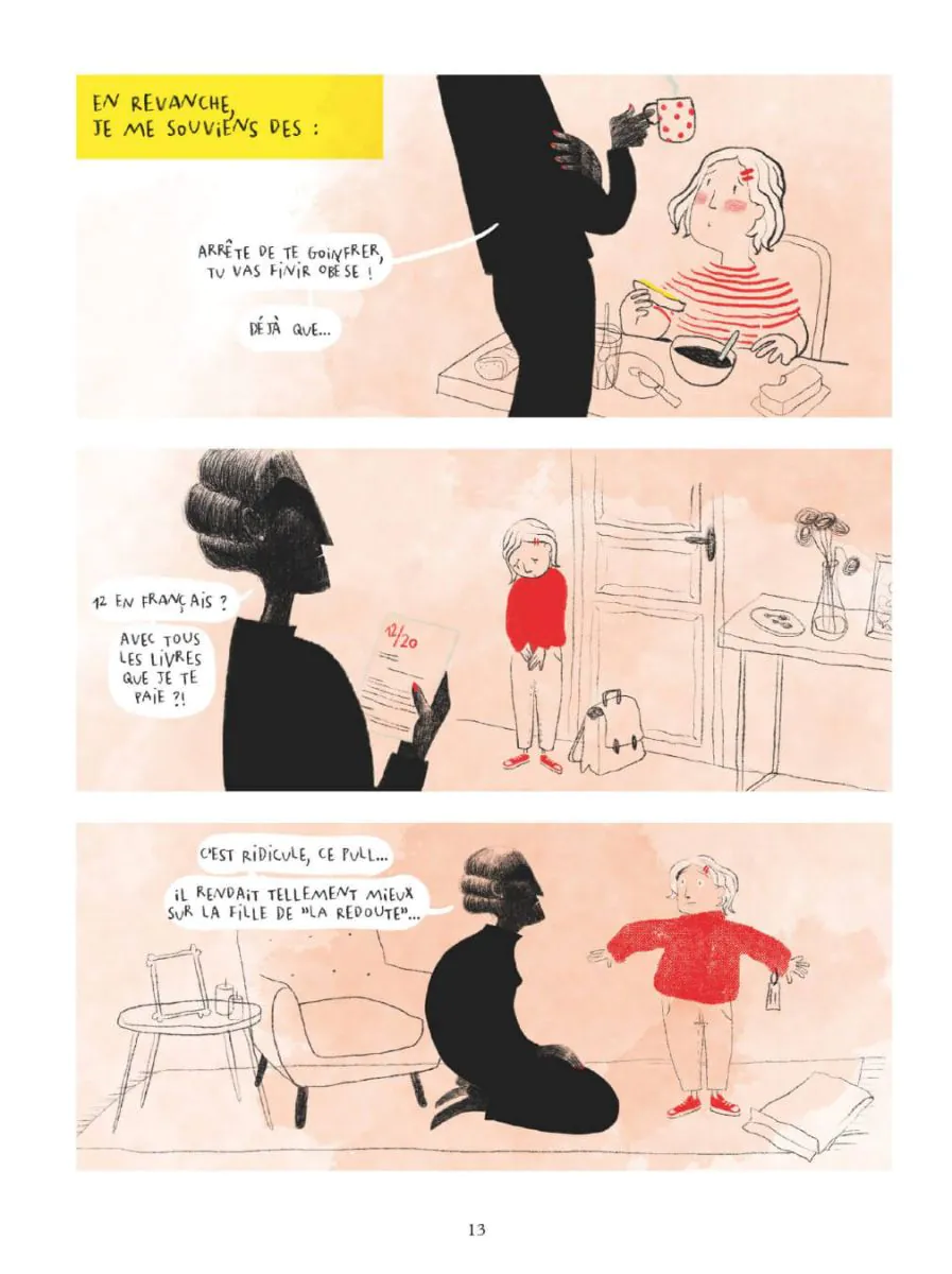 Résumé de l’éditeur : Mère de 3 enfants, Alix mène une vie plutôt épanouie aux côtés d’un époux aimant et d’amis fidèles. Un jour, au détour d’une conversation, sa mère assène une de ces remarques désobligeantes, dont elle seule a le secret. Mais cette fois, c’est la fille d’Alix qui en est la cible. C’en est trop pour elle. Soudain, toutes les années de souffrances enfouies, les humiliations et les mauvais traitements subis durant l’enfance refont surface. Pourquoi cette femme lui rend-elle la vie impossible ? Les constantes critiques et le manque de considération de la part de cette mère énergivore vont pousser Alix à s’interroger… D’après les spécialistes, 20 % de la population aurait grandi aux côtés d’un parent « toxique ». Commence alors, pour Alix, un long chemin. Sa douloureuse prise de conscience pour briser l’emprise et défaire ses liens va la mettre à rude épreuve. Face à l’adversité et aux désillusions, Alix sent bientôt une boule grossir au fond de sa gorge ; une boule qui l’entrave et qui brûle comme une envie de reprendre le contrôle sur sa vie et de crier tout haut son indépendance… Sophie Adriansen nous livre un récit foudroyant, à la fois drôle et terrible qui décortique le mécanisme insidieux de l’emprise. Le trait expressif de Mlle Caroline illustre le vertige que cette silhouette maternelle, inquiétante et anonyme inspire. Un témoignage libérateur à la mise en scène subtile qui aborde, sans fard, un sujet d’actualité lourd de sens.