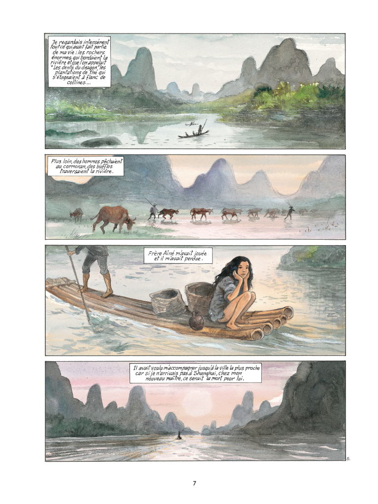 Résumé de l’éditeur : 1920, Li, sept ans, jouée et perdue par son oncle, est envoyée à Shanghai. Son nouveau maître, le cruel Zhang Xi Shun, est l’un des dirigeants de la triade « la Bande verte » qui domine la ville. Li, affectée aux cuisines, est un jour accusée d’avoir volé du papier de riz et portée devant son maître. Celui-ci découvre alors chez cette créature chétive, un don pour le dessin. Cela lui vaudra de prendre une place spéciale auprès de ce personnage terrifiant mais raffiné…