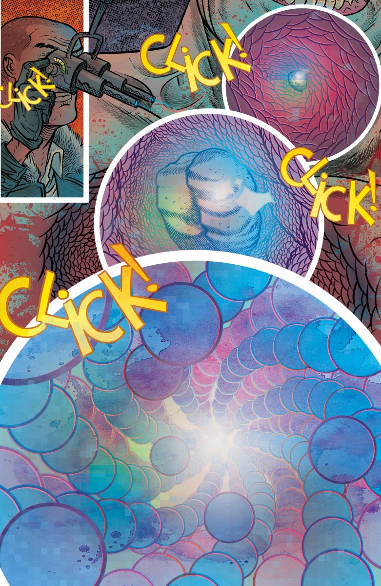 Et dans ces conditions, sa créativité ne semble pas trouver de limite. Que ce soit dans la composition des pages, les effets graphiques ou encore la colorisation acidulée voire psychédélique, on est absolument subjugué.
