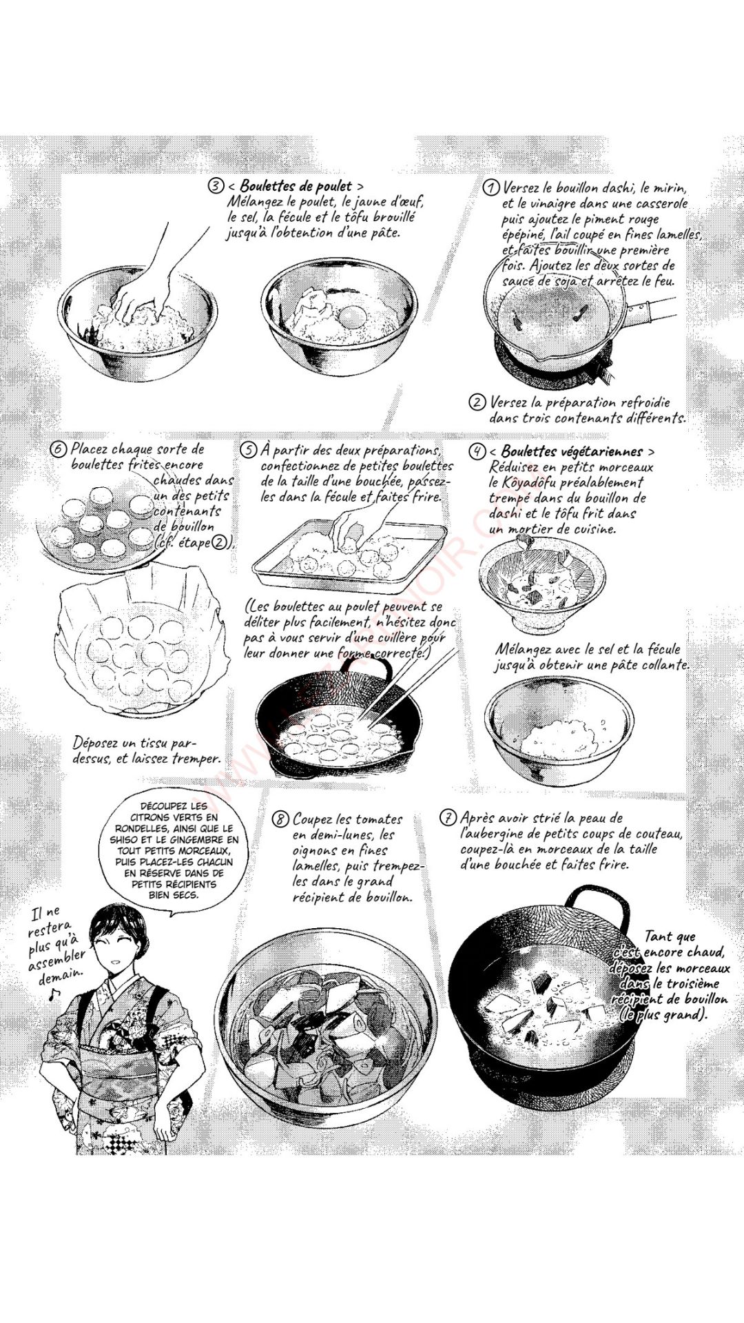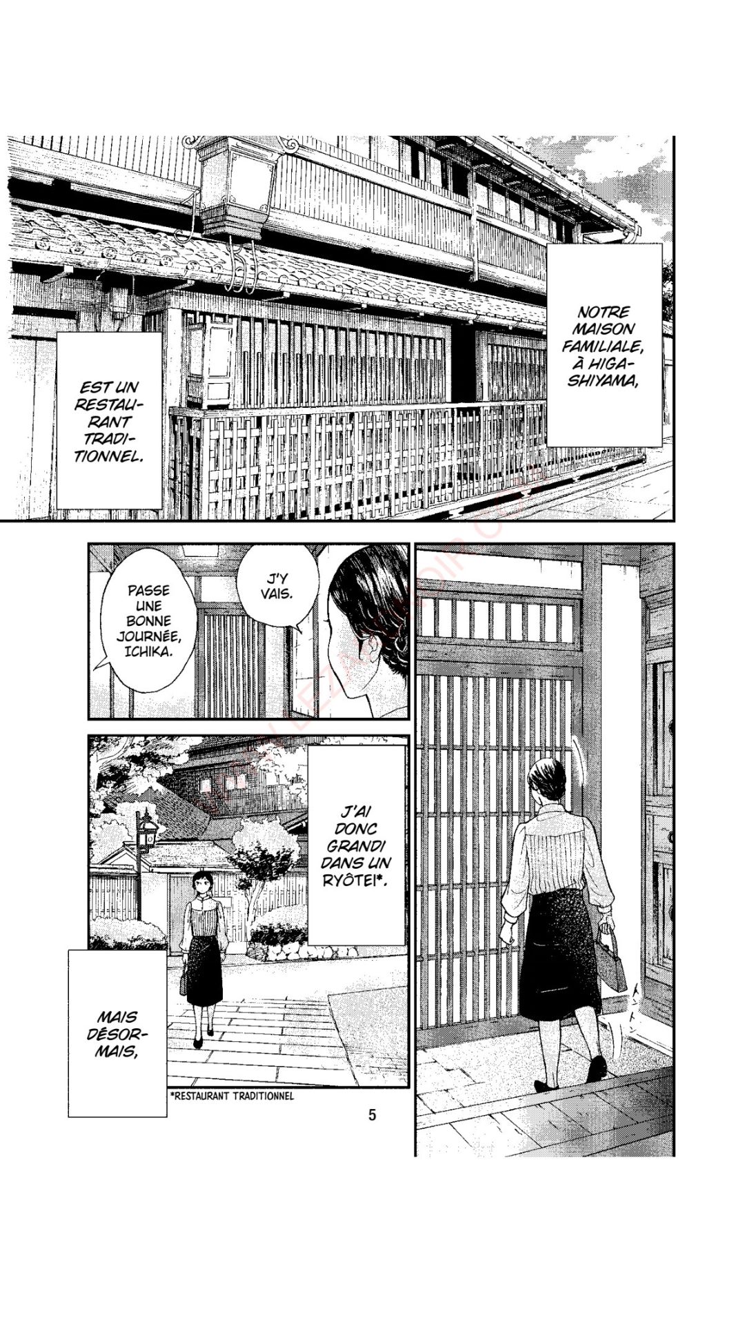 Résumé de l’éditeur : 1951, Kyôto. Fille aînée du restaurant traditionnel « Maison Kuwanoki », Ichika (34 ans) a perdu son époux durant la guerre, et travaille désormais comme commis de cuisine dans un hôtel. Au bord de la faillite, les Kuwanoki décident de conclure une alliance matrimoniale avec Amané (19 ans), fils d’une famille influente d’Osaka, afin de bénéficier d’un support financier. Le nouveau gendre ne mâche pas ses mots pour dénoncer la vétusté de la Maison Kuwanoki… Et sa famille à Osaka prévoirait de surcroît de prendre la main sur le restaurant… ?