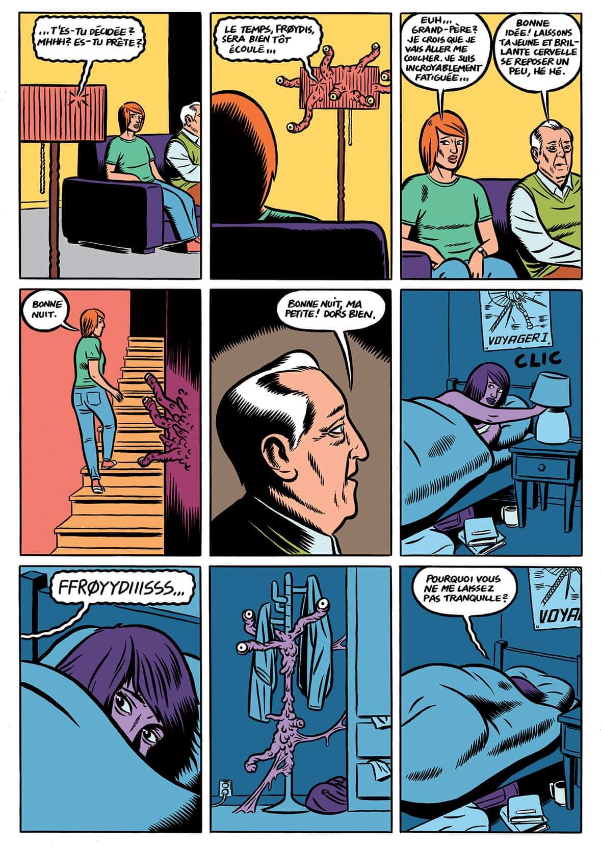 Avec ses pages bien léchées, gaufrier à 9 cases, encrages épais, grands aplats de couleurs, joli travail sur les contrastes, l’auteur nous mène là où il l’a voulu, dans cet autre monde où l’horreur peut surgir à tout instant.