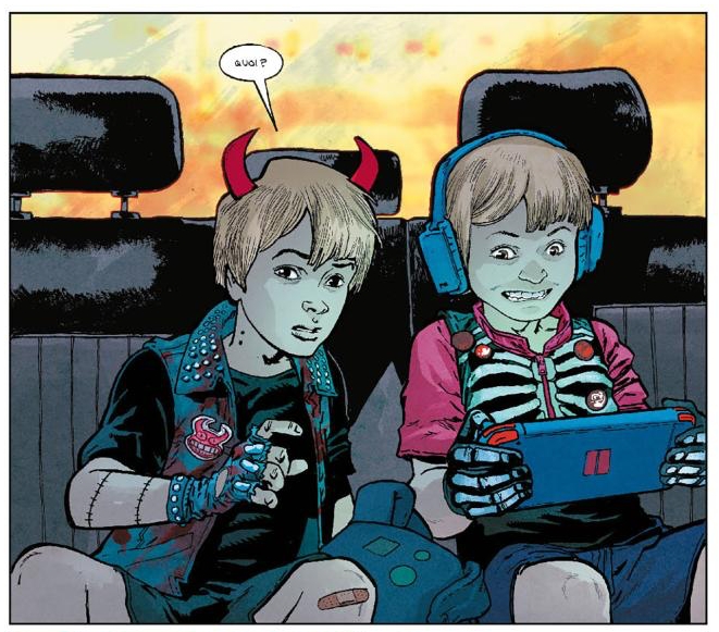 Par la suite, on en découvrira plus sur les secrets des Halloween, notamment à travers la naissance et l’enfance des deux enfants par des analepses en noir et blanc, mettant en lumière le brillant travail du coloriste Adriano Lucas. Dans ce nouveau tome, ce sont notamment les étranges circonstances autour de leur naissance et l’essence de leur relation qui se verront traitées.