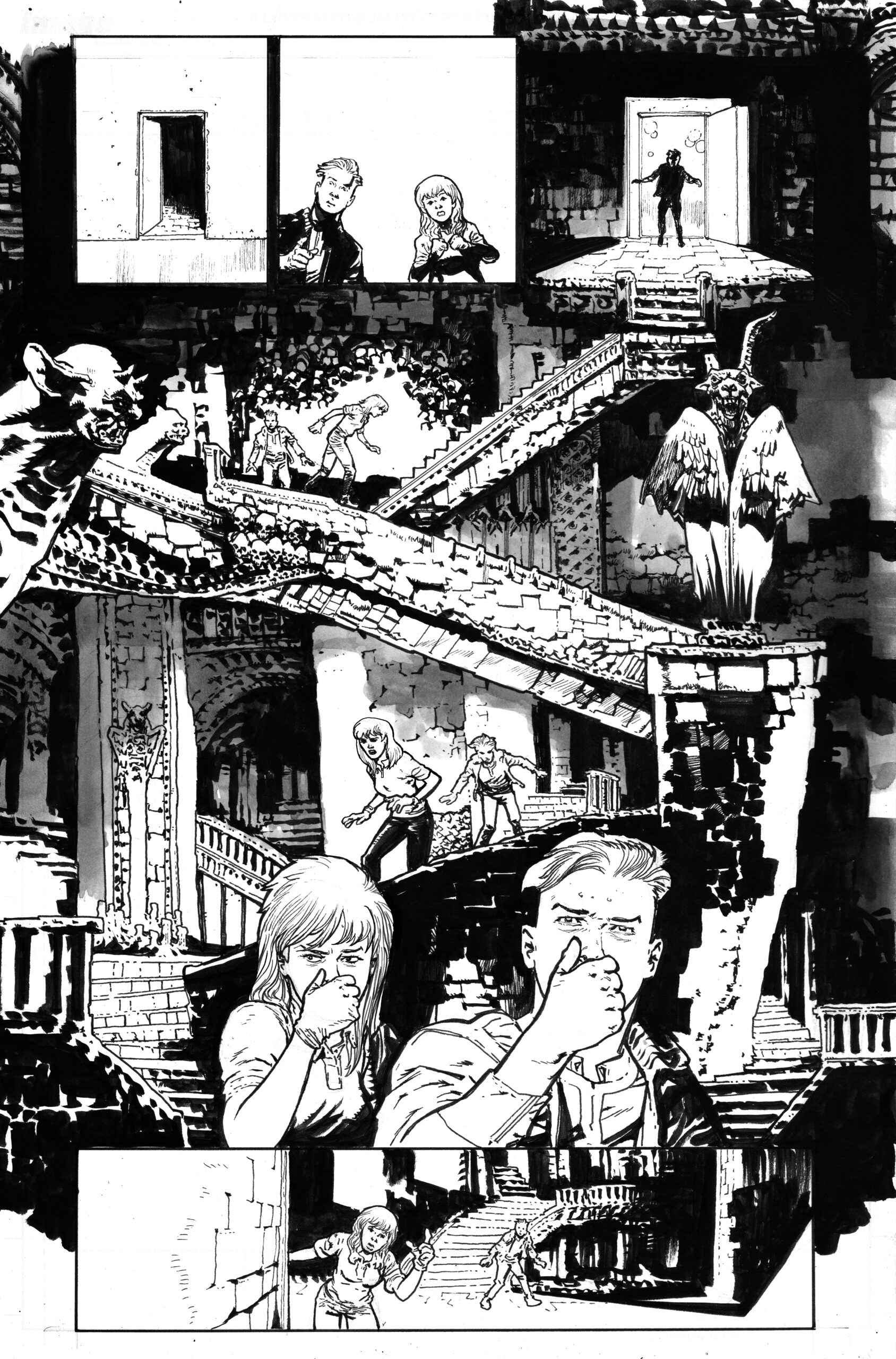 Pour se plonger dans les secrets du parc, les deux protagonistes de ce tome se retrouvent à pousser des portes interdites. Des portes derrière lesquelles se trouvent notamment cette page où Bressan s’amuse avec le dessin en presque pleine page d’un escalier secret, où les personnages avancent autant à l’aveugle qu’un touriste en correspondance à Châtelet. Le lecteur, lui, se plaît à essayer d’avancer les différentes pièces du puzzle qui lui sont données petit à petit par Williamson. Les éditions Delcourt proposent d’ailleurs une séparation intelligente entre le tome 1 et 2. Le second joue désormais sur l’alternance des issues originales, entre un début toujours en noir et blanc et la suite en couleurs.