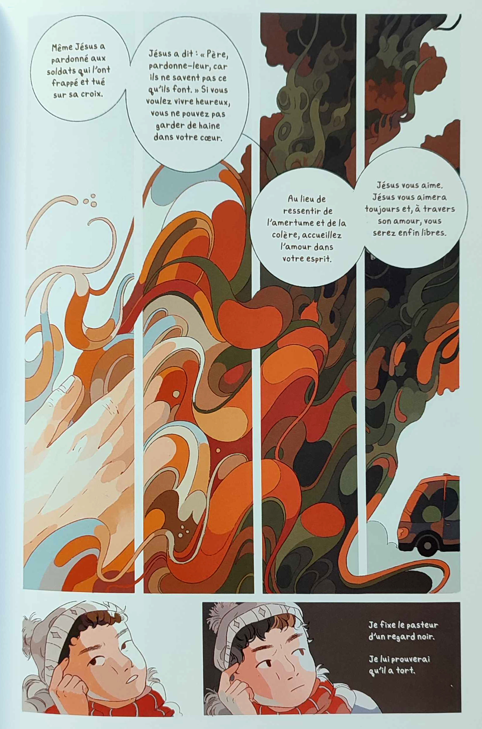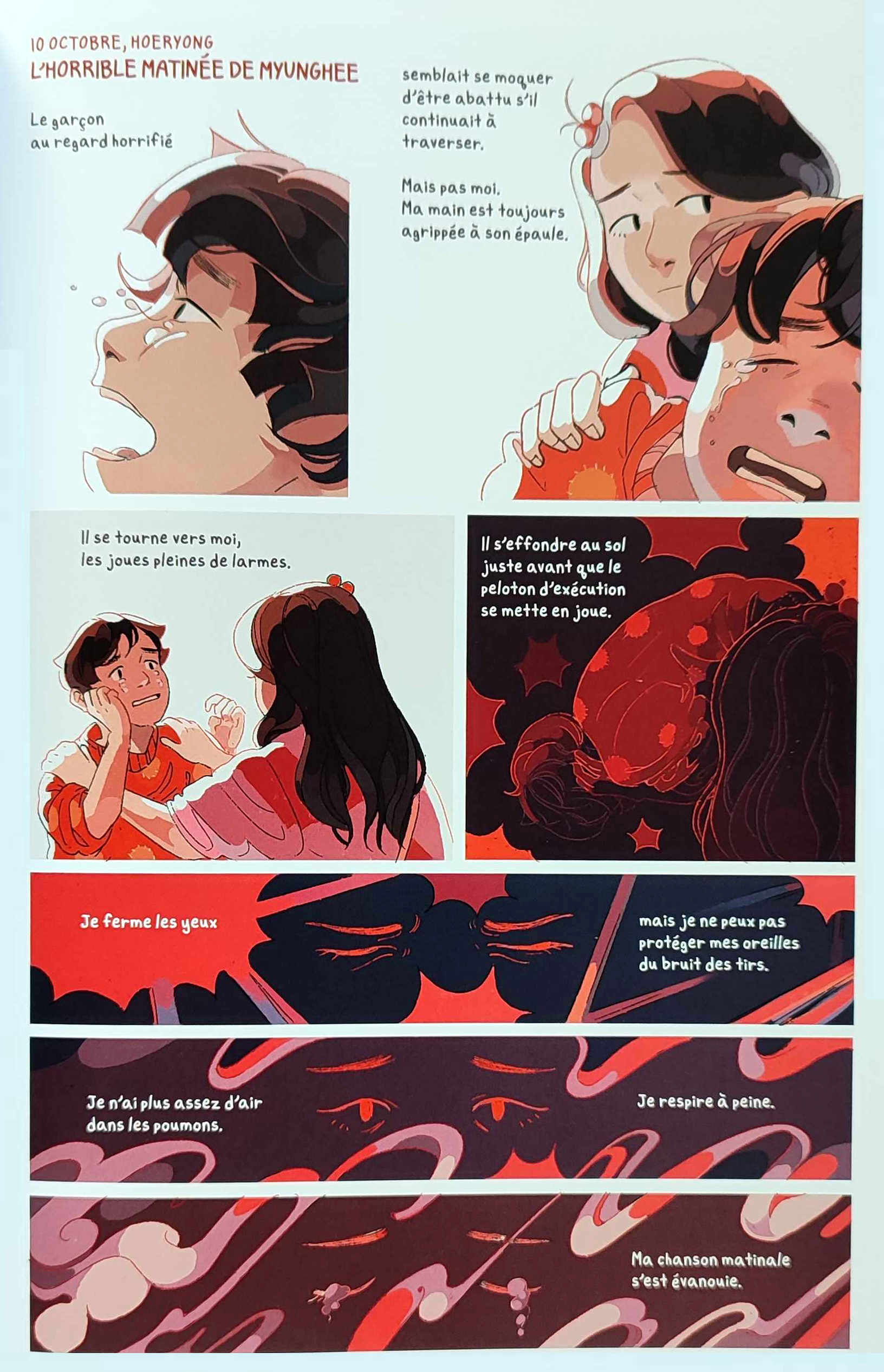 Ce récit ne laisse pas indifférent. Que ce soit grâce à la mise en pages, aux couleurs intenses, aux dessins presque oniriques par moment, aux mots de Tina Cho qui nous plongent dans ces deux points de vue. On s’émerveille autant qu’on s’inquiète du destin de ces deux enfants. Le destin croisé de ces deux enfants devient rapidement le nôtre, en lisant les premières pages. Chaque touche d’espoir est une respiration.