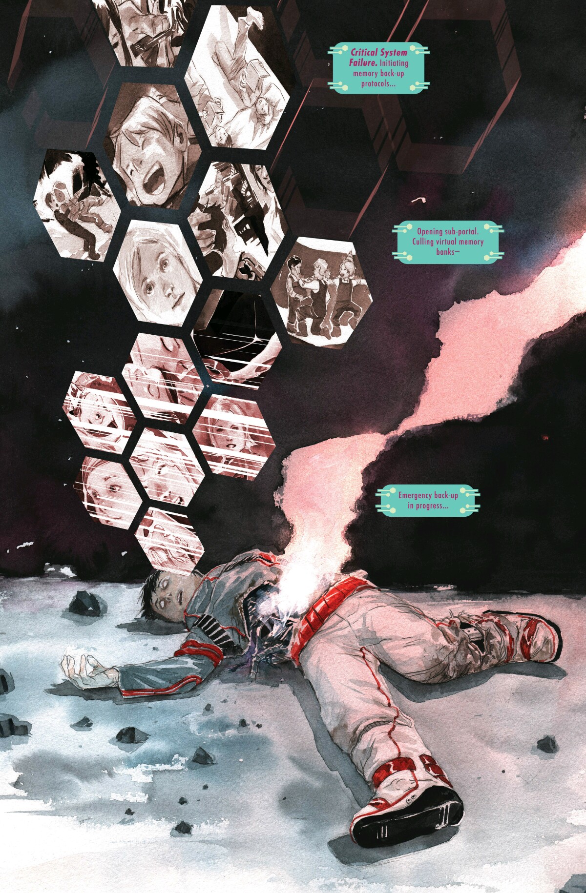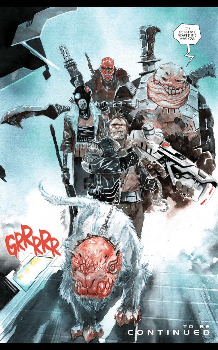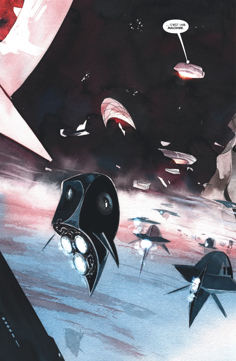 Le récit de Jeff Lemire est un très bon récit de science-fiction construit comme un space opera, ayant de nombreuses portes d’entrée : tout d’abord, le scénariste du formidable Sweet Tooth construit un système politique complexe autour d’un conglomérat de planètes et donc d’un parlement de représentants comme dans Star Wars. Ce dernier sera mis à mal avec les pogroms initiés par les robots.